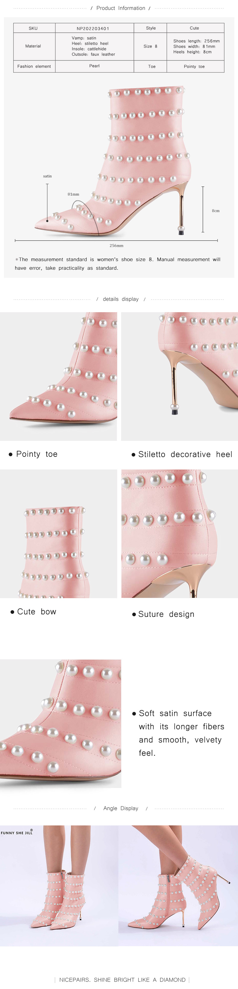 - Special Designs: Crafted with a sleek pointed toe, delicate pearl accents, and a chic heel, these boots blend timeless elegance with modern flair. The soft pink hue and refined details make these boots a standout addition to your wardrobe.