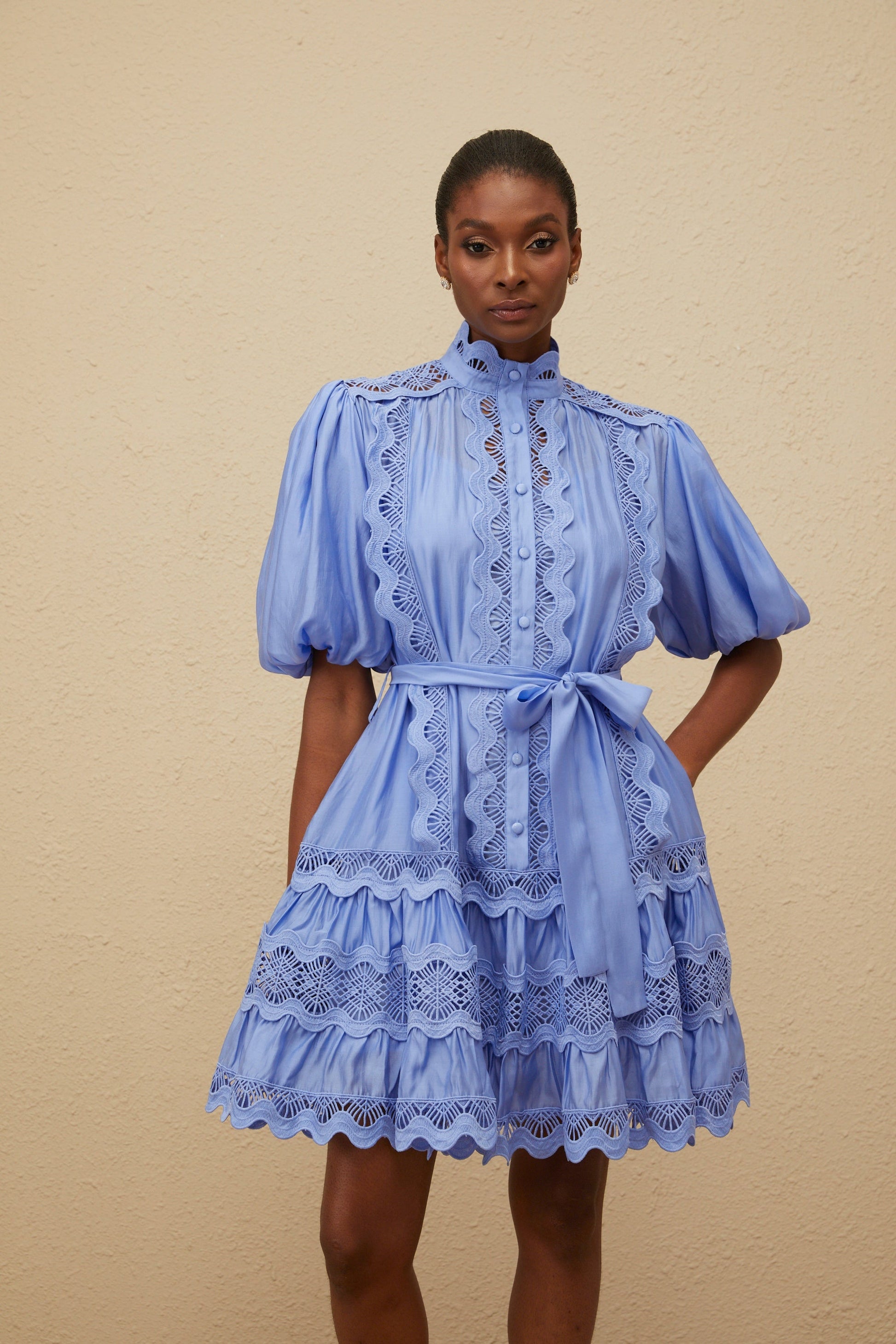Poema Blue Tiered Motif Embroidered Mini Dress