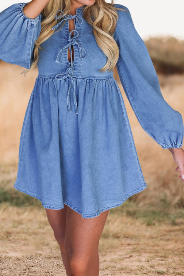 Vintage Lace-Up Bell Sleeve Denim Dress
