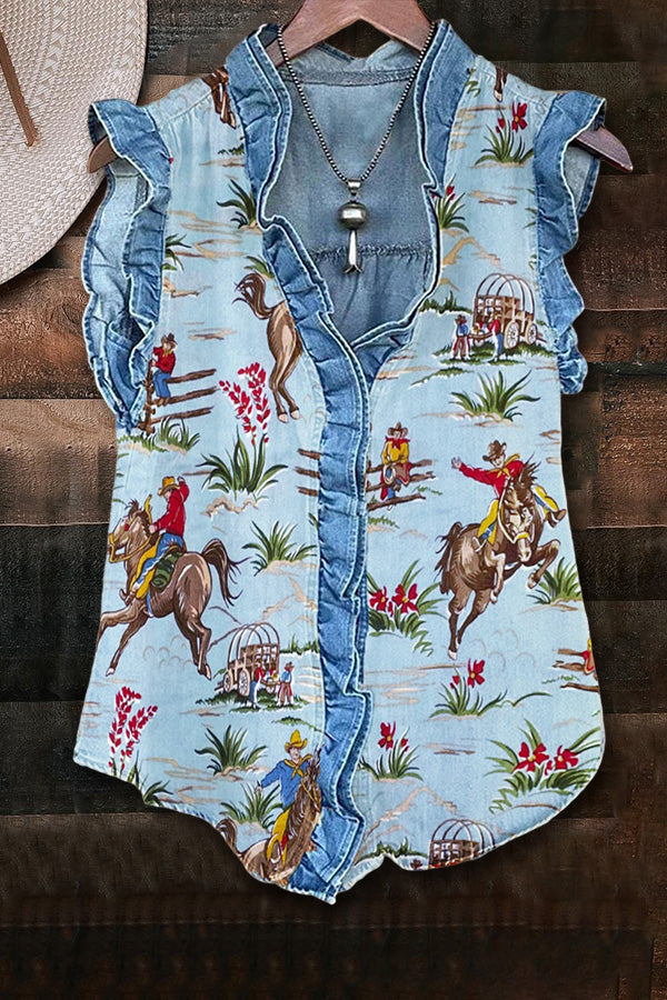 Vintage Wild West Printed Ruffled Sleeveless Shirt