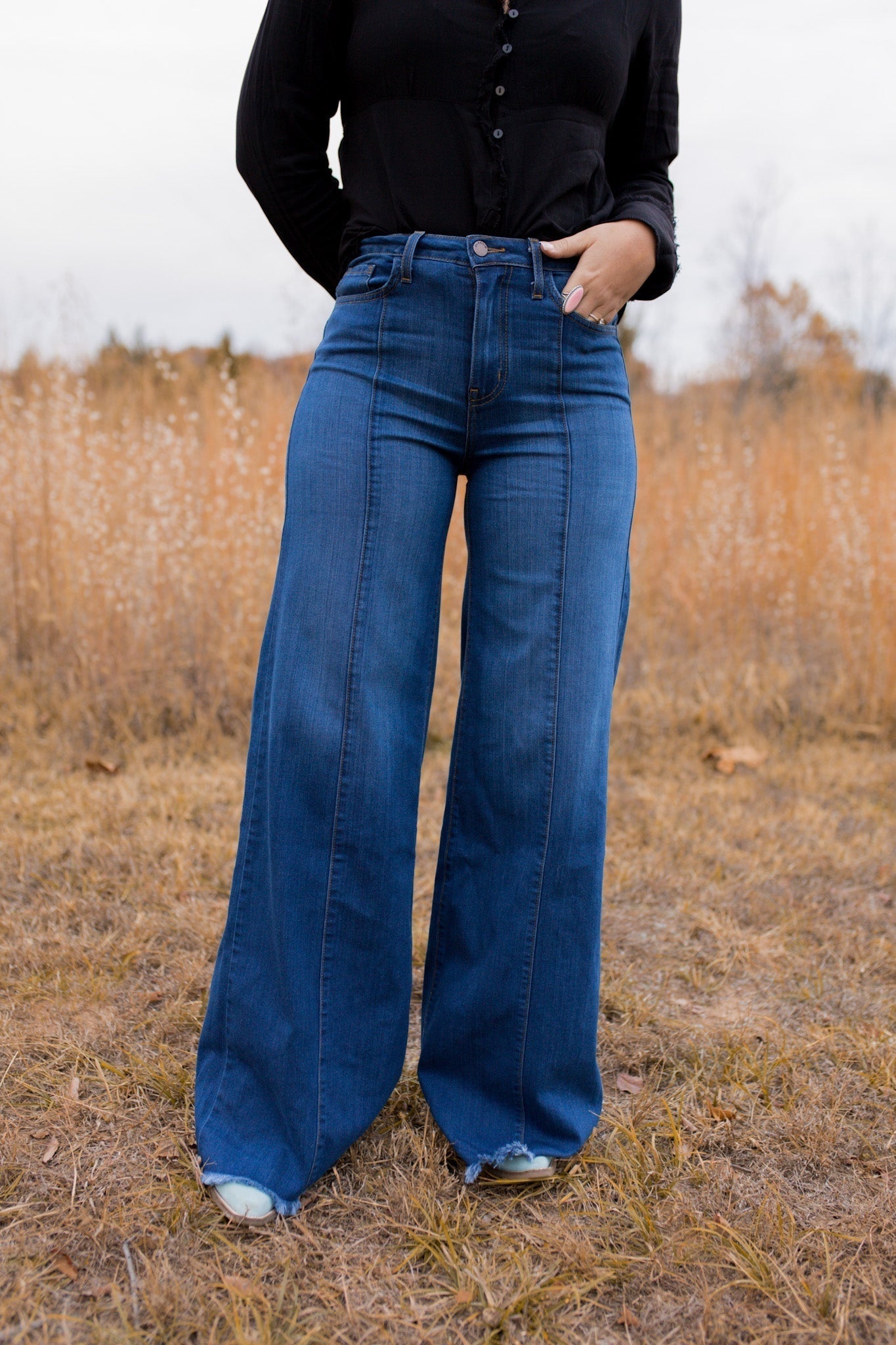 Stay on trend this season in our new casual, flared jeans. We especially love the blue fabric and think this piece will be a new favorite in your closet!