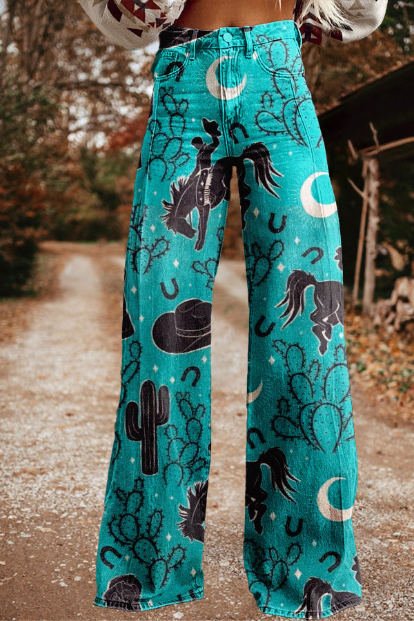 Retro Western Cowboy Print Wide Leg Pants