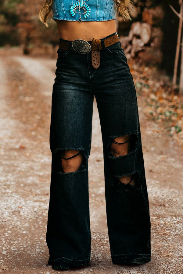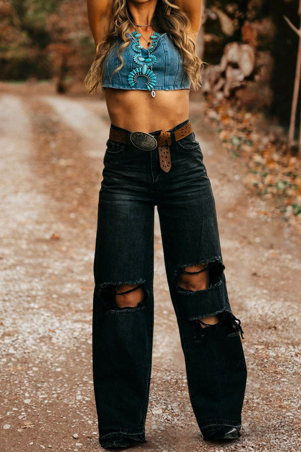 Vintage Washed Ripped Wide Leg Jeans