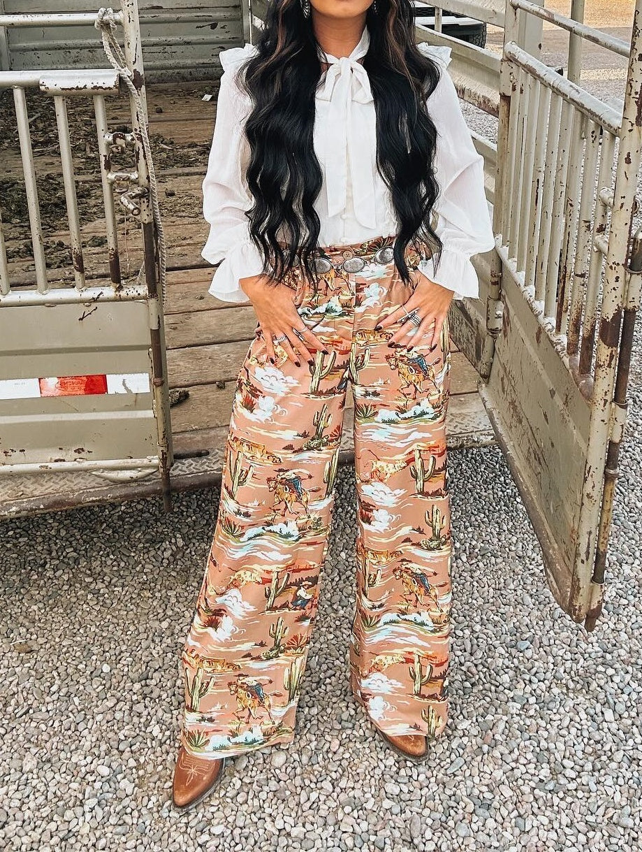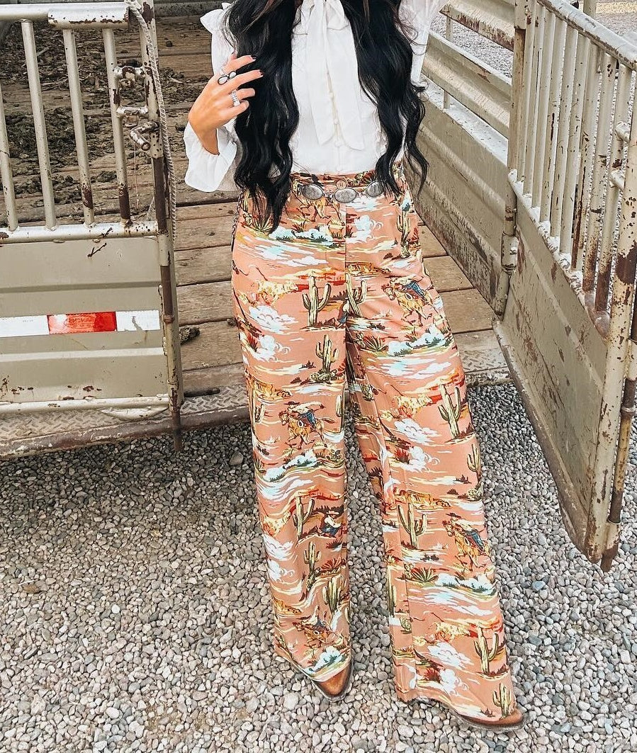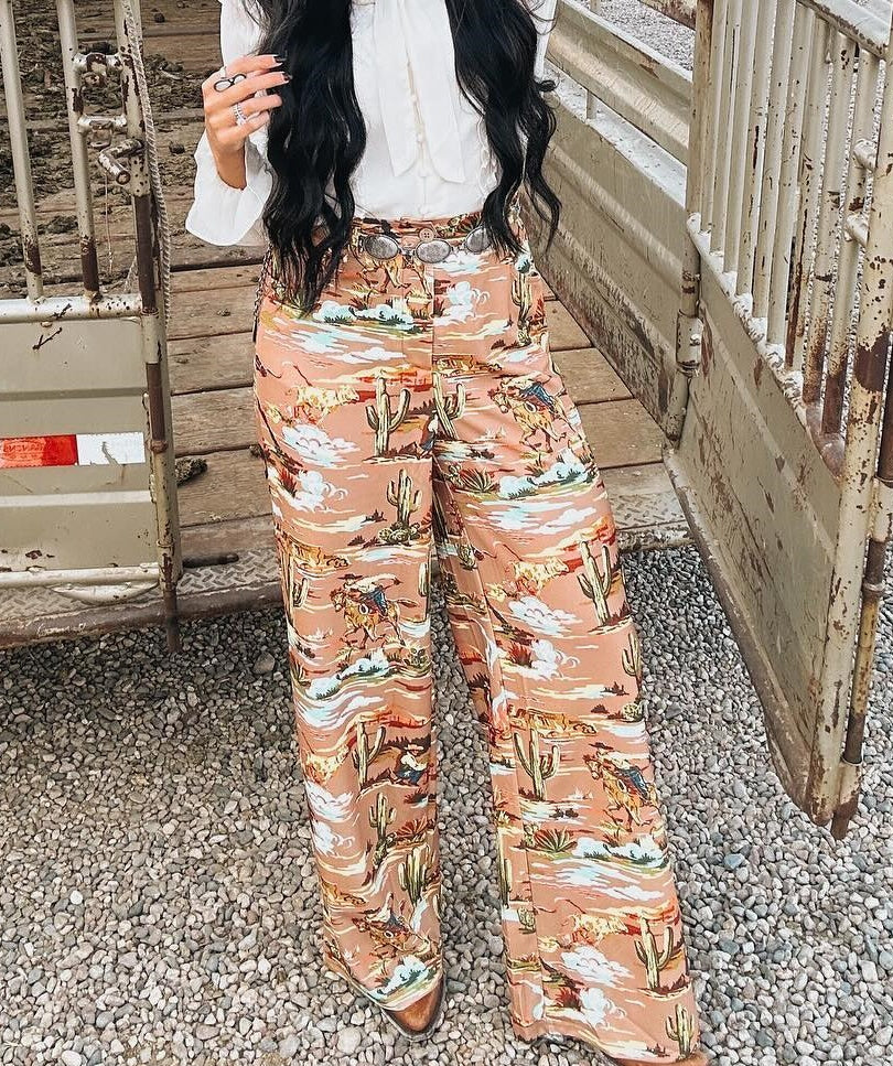 Stay on trend this season in our new retro, flared pants. We especially love the abstract print fabric and think this piece will be a new favorite in your closet!