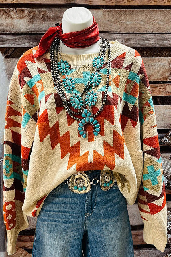 Stay on trend this season in our new casual, round neck sweater. We especially love the graphic print fabric and think this piece will be a new favorite in your closet!