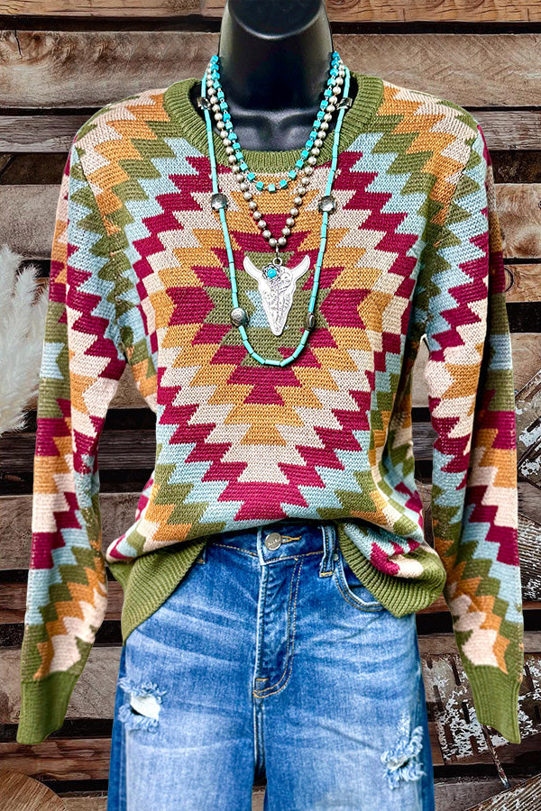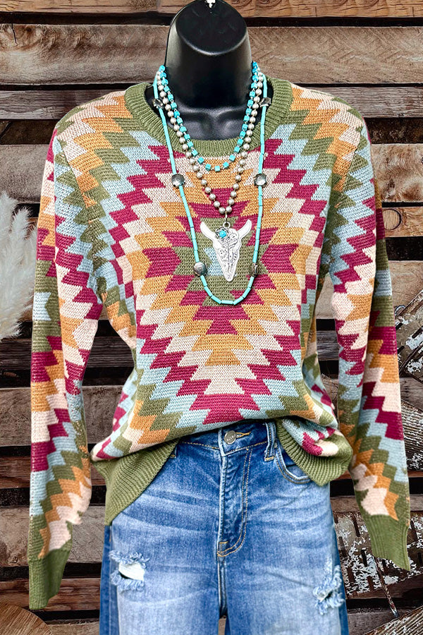 Stay on trend this season in our new casual, round neck sweater. We especially love the graphic print fabric and think this piece will be a new favorite in your closet!