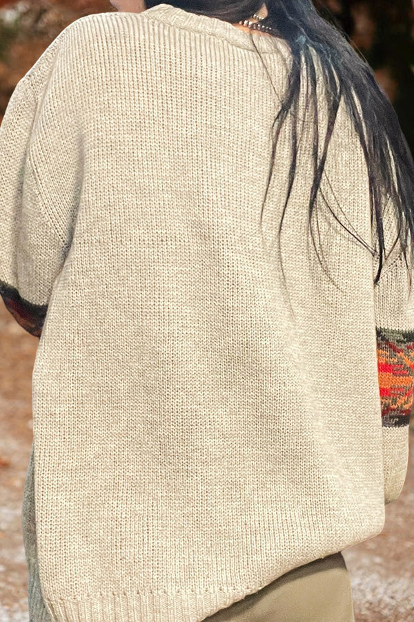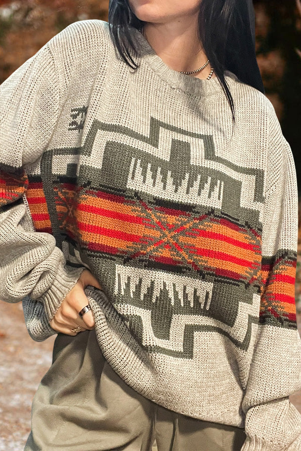 Stay on trend this season in our new casual, round neck sweater. We especially love the graphic print fabric and think this piece will be a new favorite in your closet!