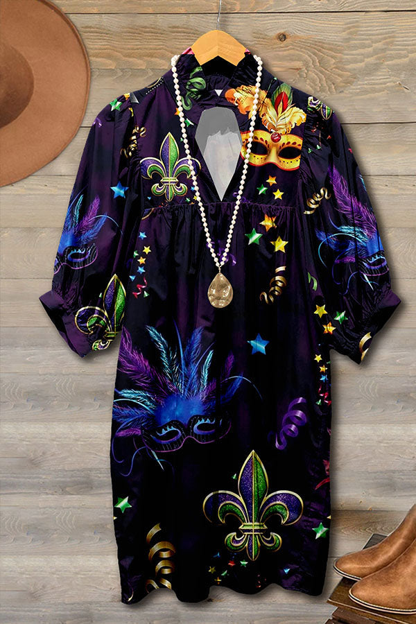 Mardi Gras Mask V-Neck Ruffled Puff Sleeve Dress