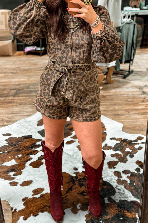 Wild Leopard Print Puff Sleeve Zipper Romper