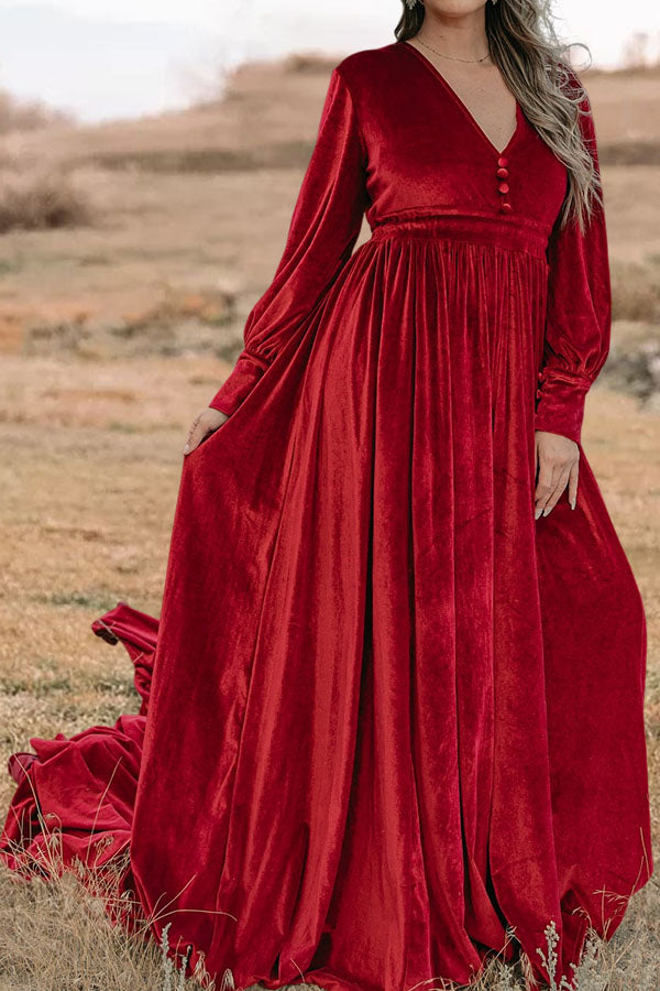 Velvet V-Neck Button-Up Maxi Dress