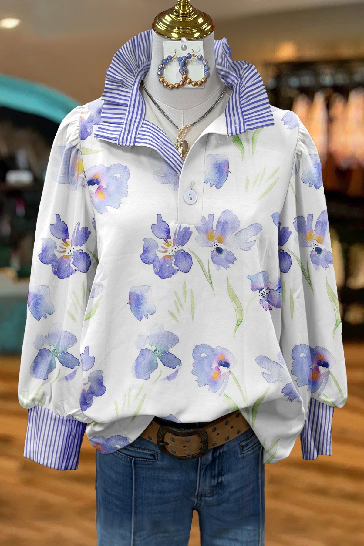 Fresh Floral Print Striped Blouse