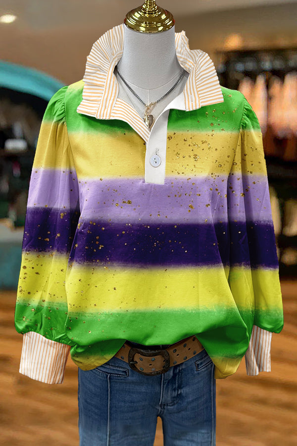 Classic Mardi Gras Print Puff Sleeve Blouse