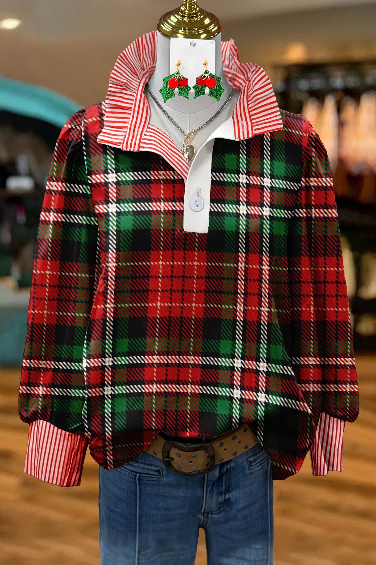 Christmas Plaid Striped Graphic Print Top
