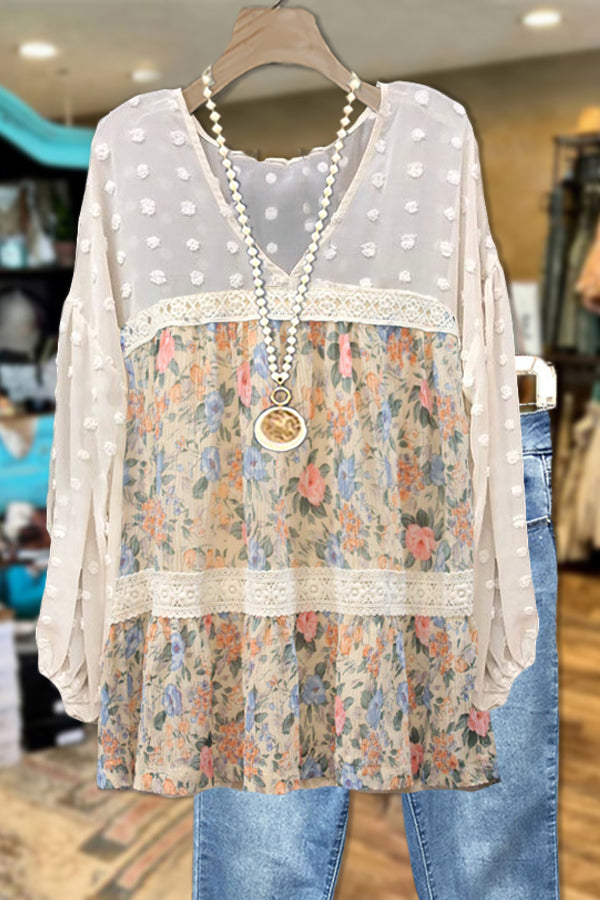 Elegant Contrast Color Stitching Lace Print Blouse