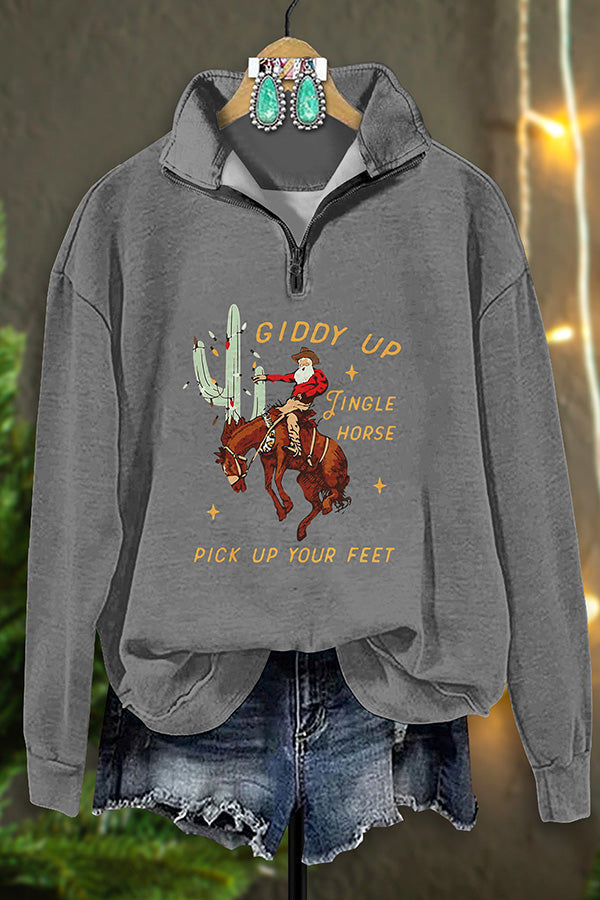 Retro Western Cowboy Santa Claus Print Zip-Up Sweatshirt