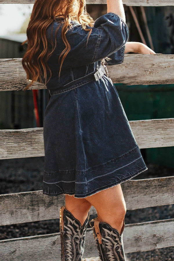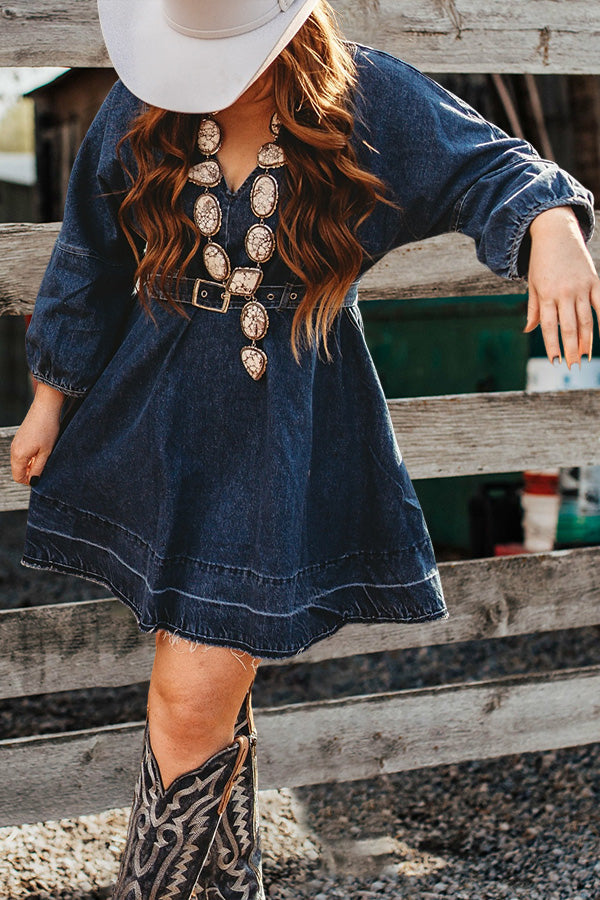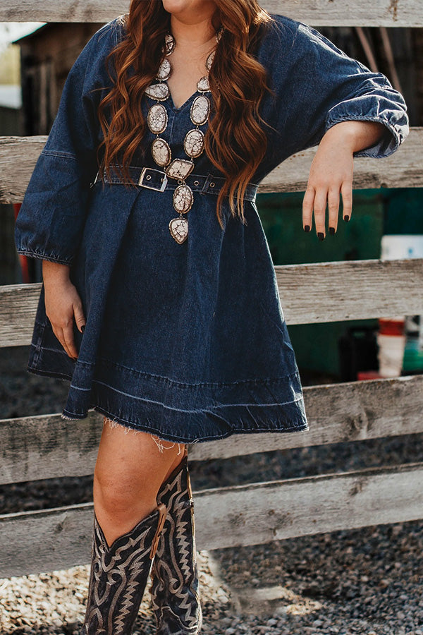 Vintage V-Neck Ruffled Denim Dress