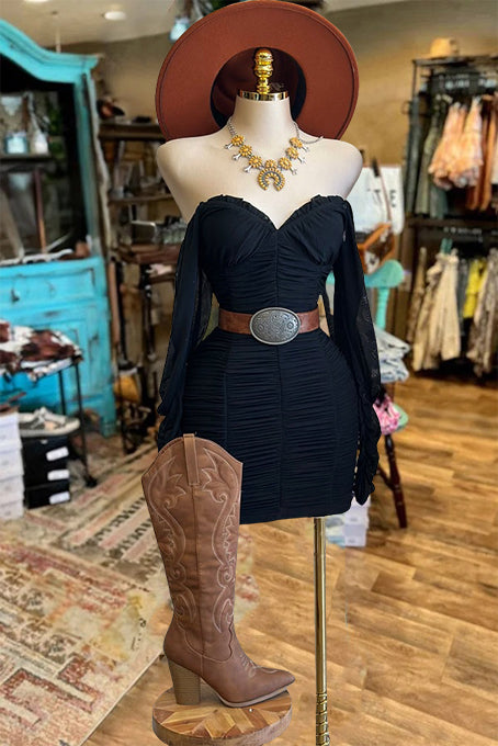 Stay on trend this season in our new pretty, off shoulder dress. We especially love the solid color fabric and think this piece will be a new favorite in your closet!