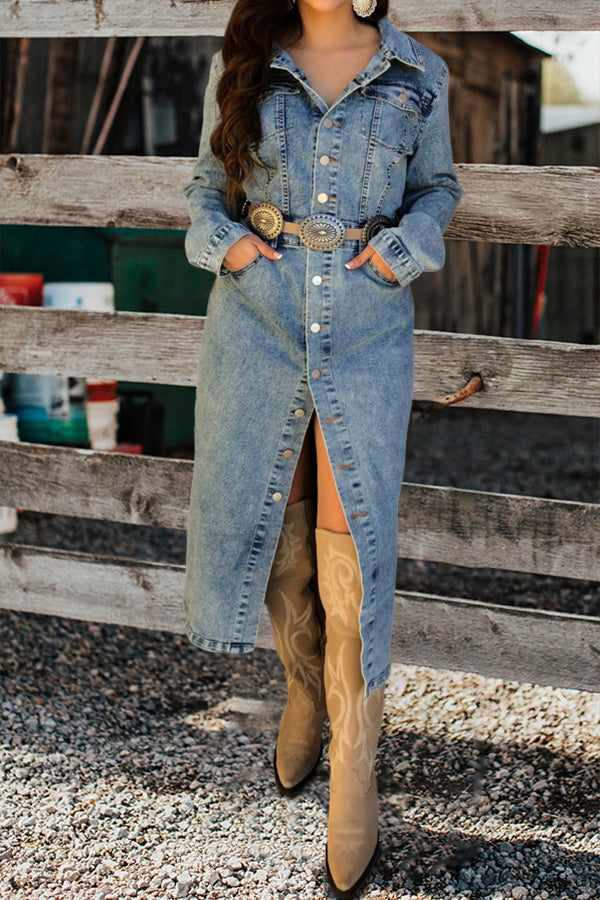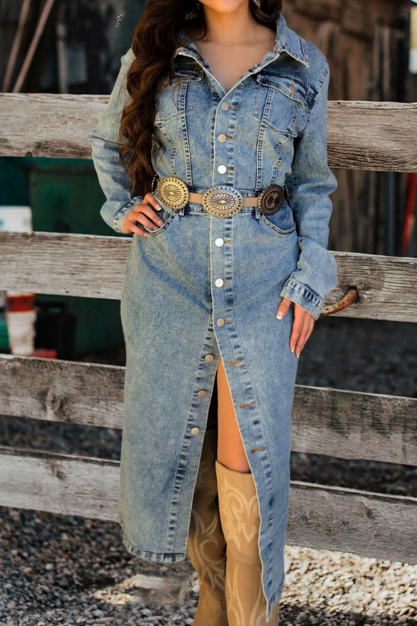 Retro Washed-Breasted Long Sleeve Denim Dress
