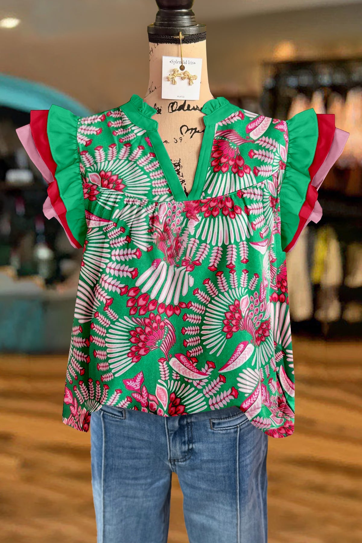 Classic Botanical Print V-Neck Fly Sleeve Blouse