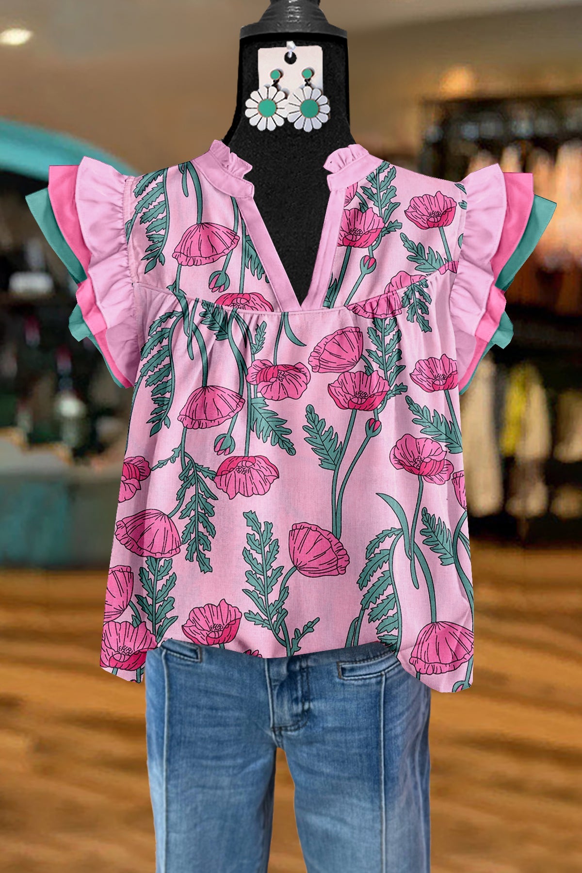 Sweet Floral Print Flying Sleeves Pleated V-Neck Blouse
