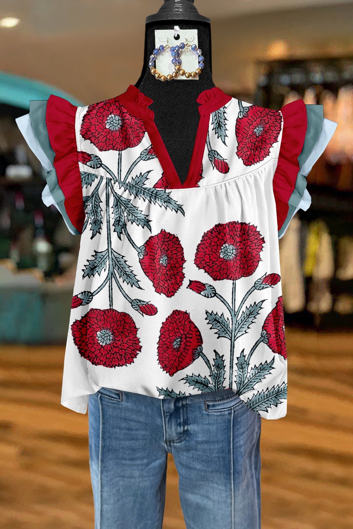 Stay on trend this season in our new classic, v neck top. We especially love the flower print fabric and think this piece will be a new favorite in your closet!