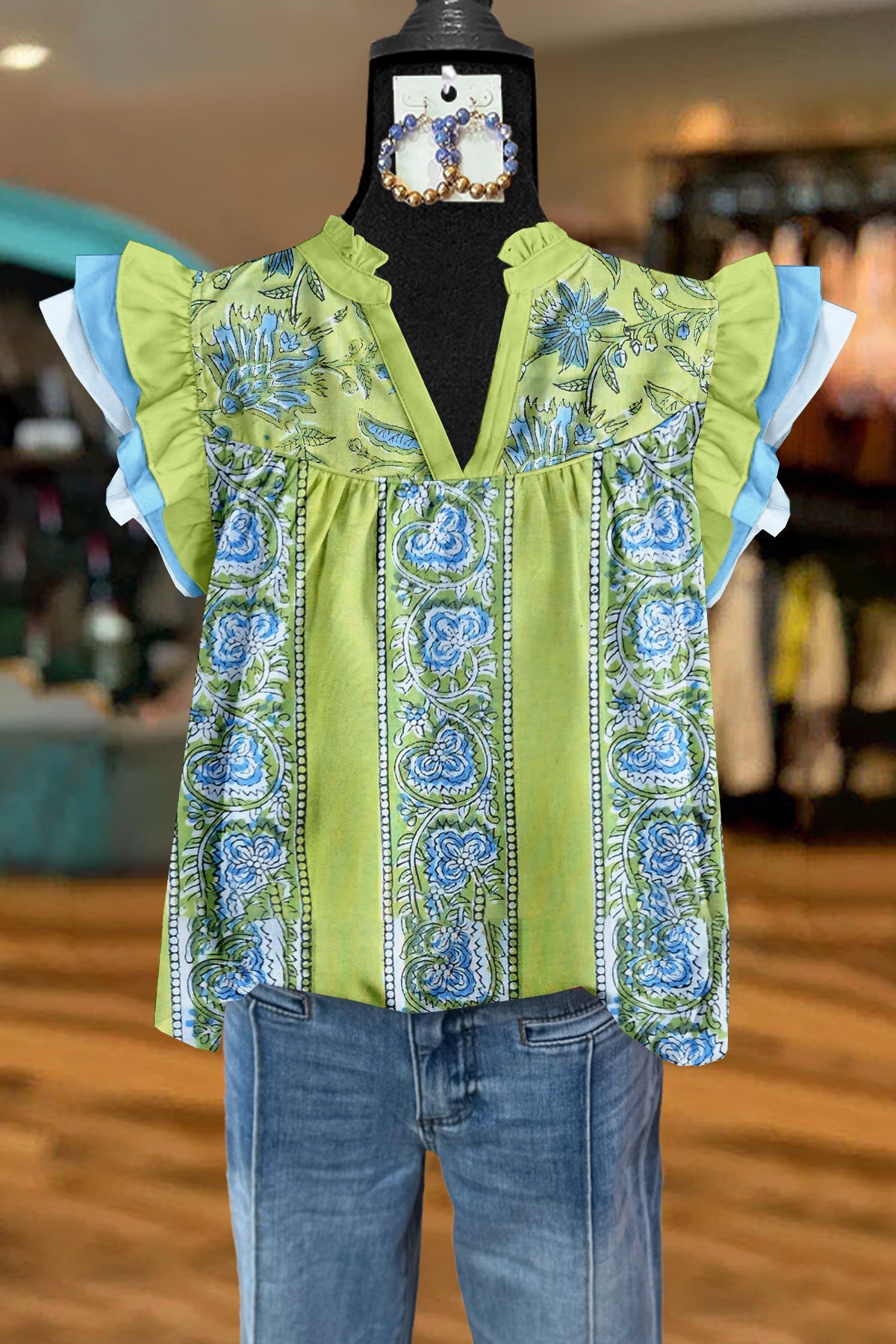 Fresh Plant Print Flying Sleeves Pleated V-Neck Blouse