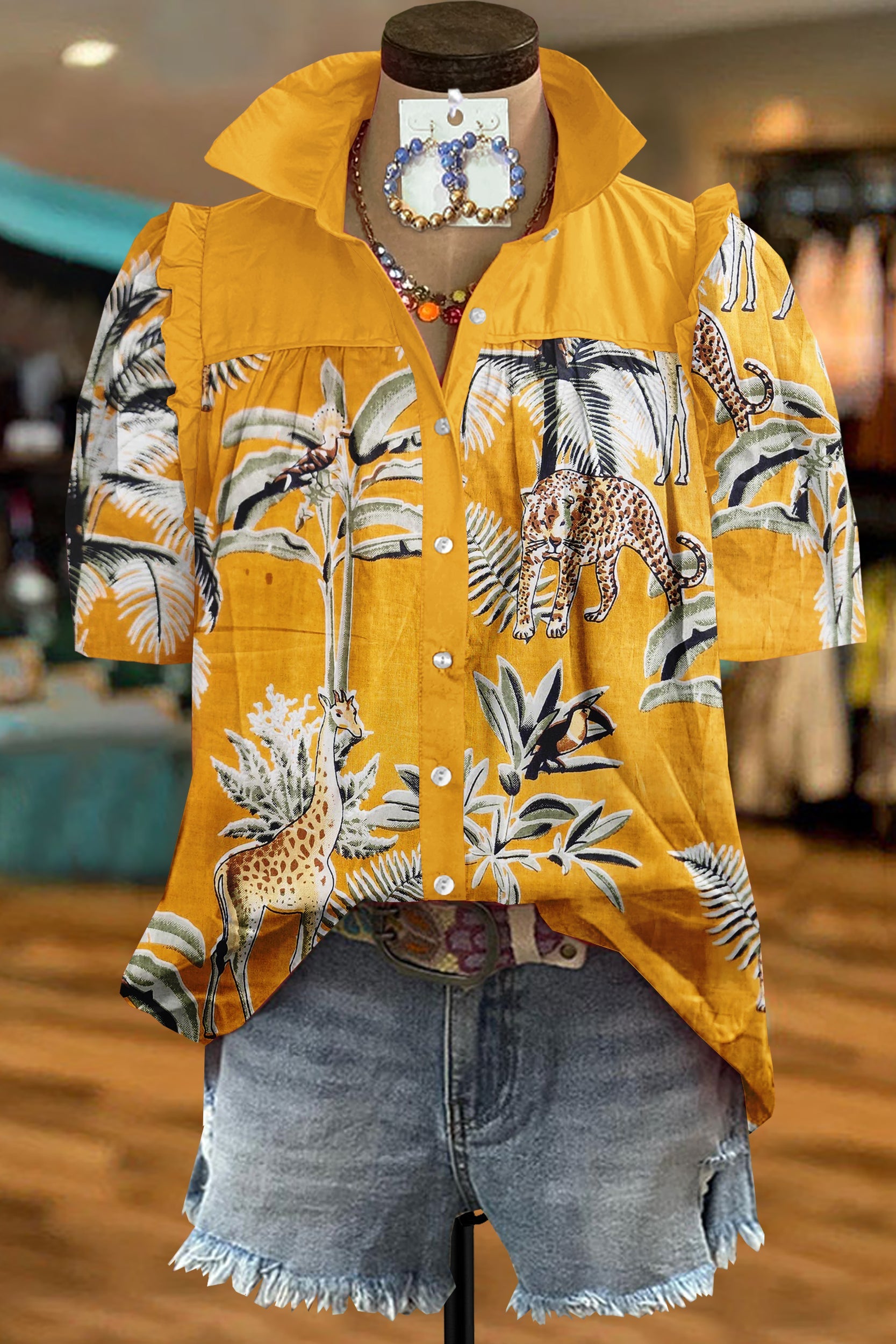 Stay on trend this season in our new classic, shirt collar top. We especially love the natural print fabric and think this piece will be a new favorite in your closet!