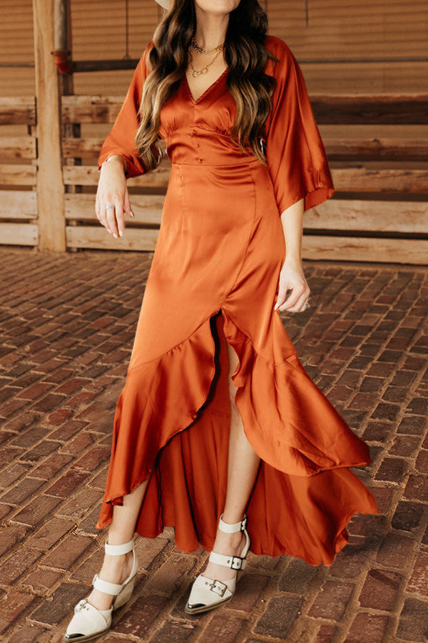 Romantic V-Neck Ruffled Slit Satin Dress