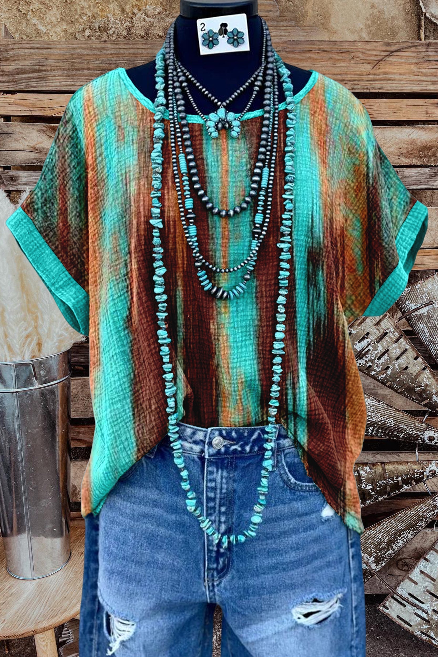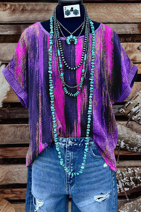 Stay on trend this season in our new retro, round neck t-shirt. We especially love the abstract print fabric and think this piece will be a new favorite in your closet!