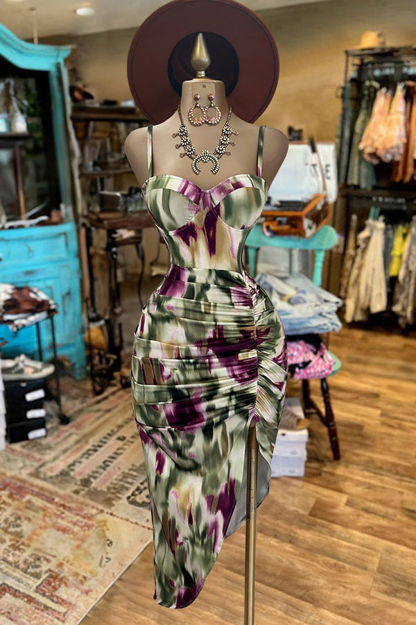 Irregular Printed Smocked Slit Dress