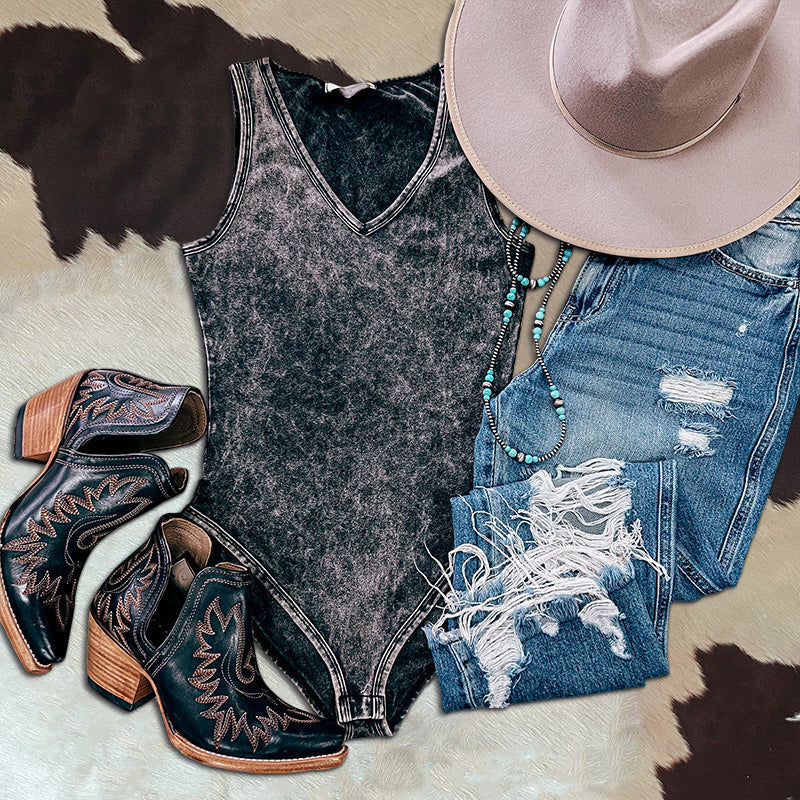 Stay on trend this season in our new casual, v neck bodysuit. We especially love the bleached fabric and think this piece will be a new favorite in your closet!