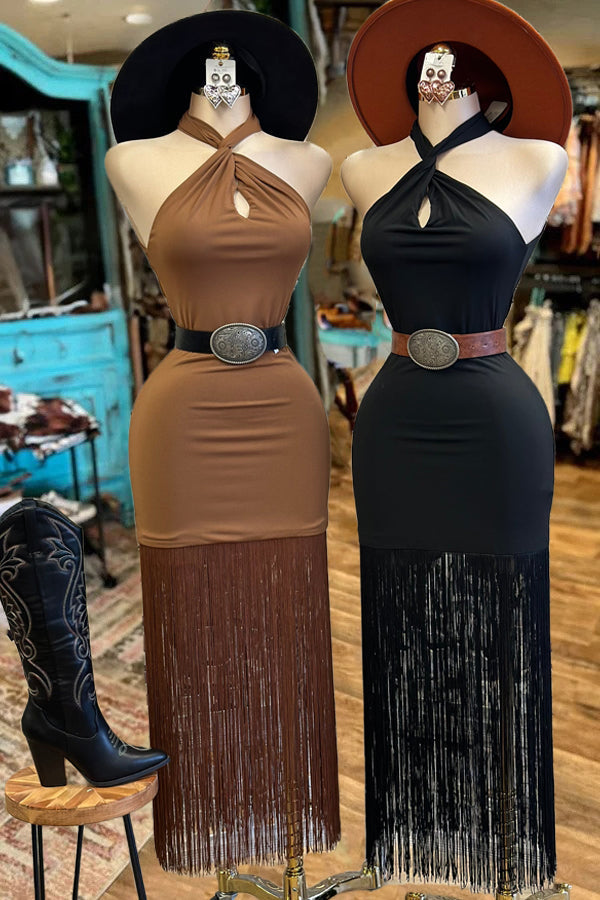 Cross Halter Long Fringe Maxi Dress
