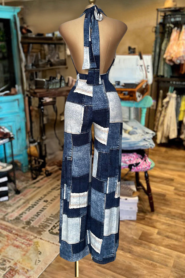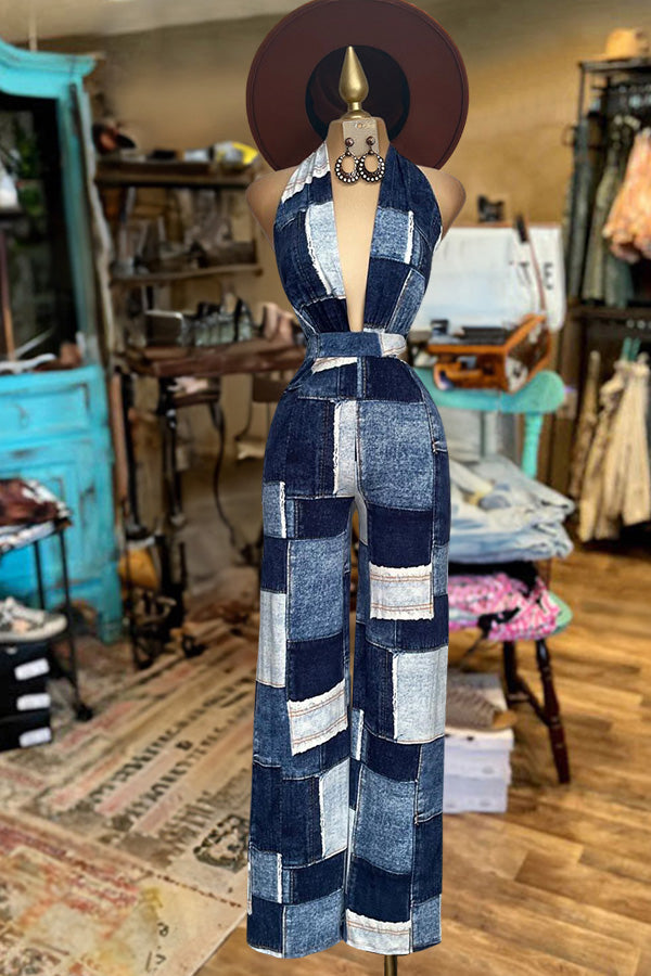 Vintage Patch Print Deep V-Neck Jumpsuit