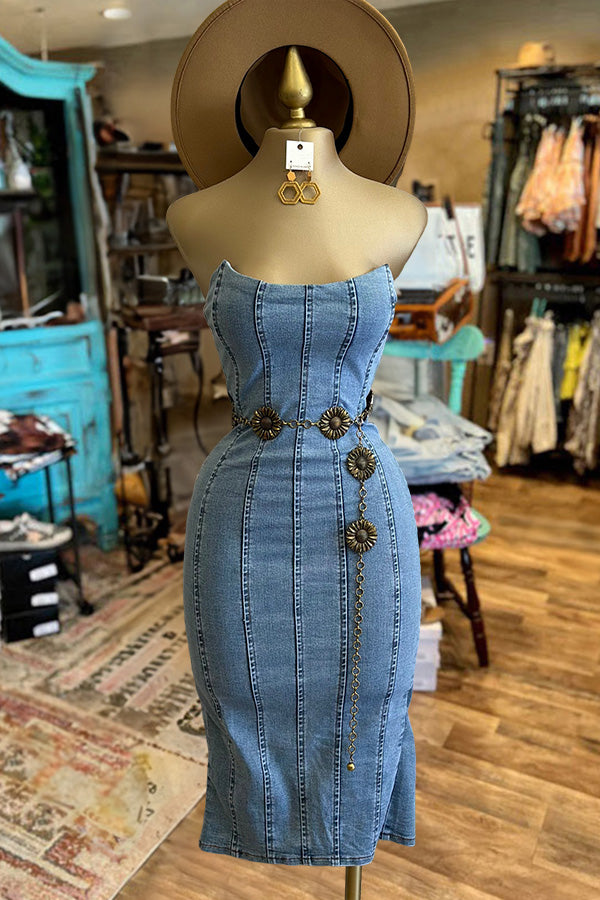 Vintage Wash Strapless Denim Bodycon Dress-0520