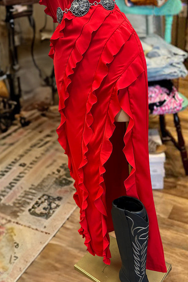 Beautiful V Neck Ruffle Slit Maxi Dress