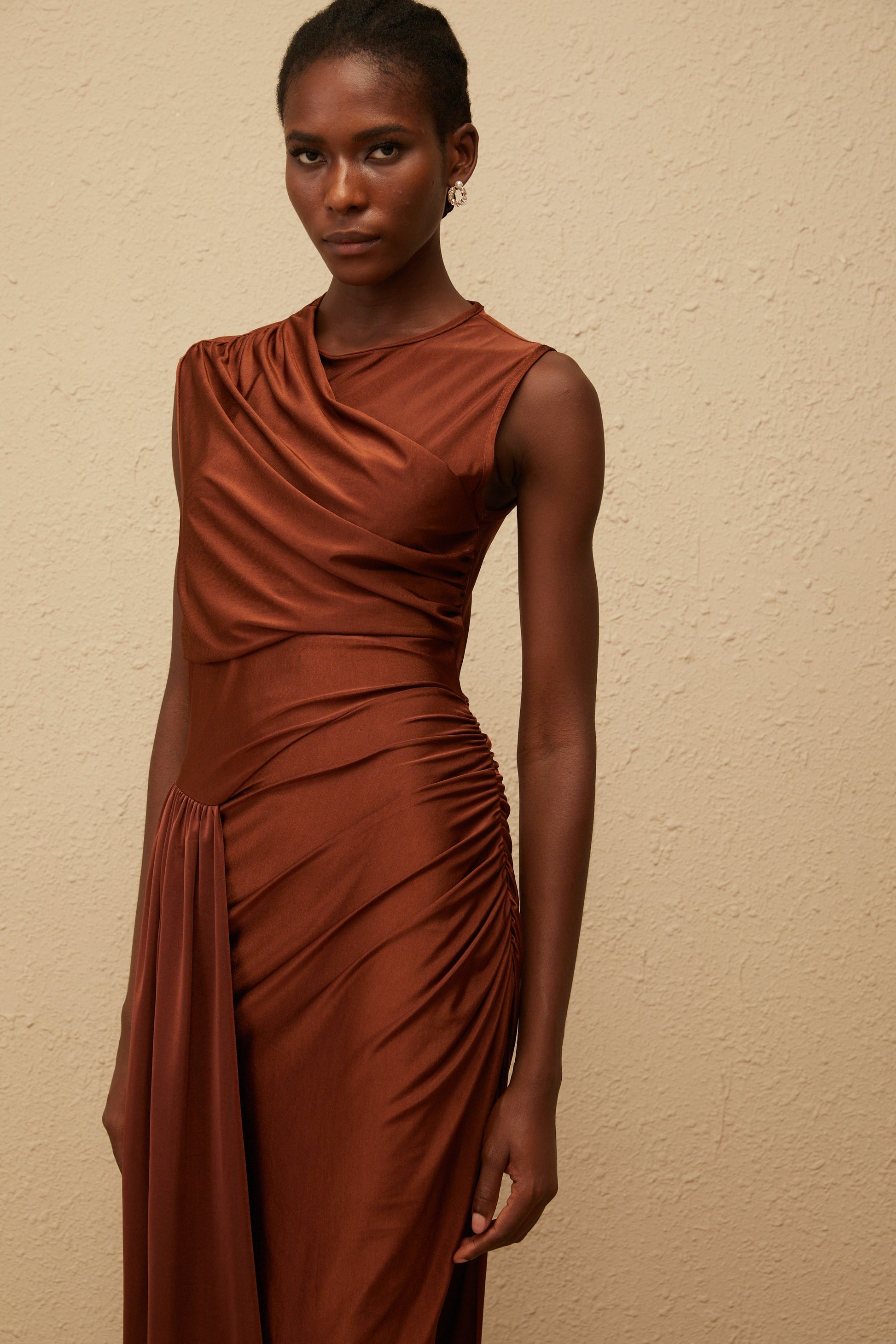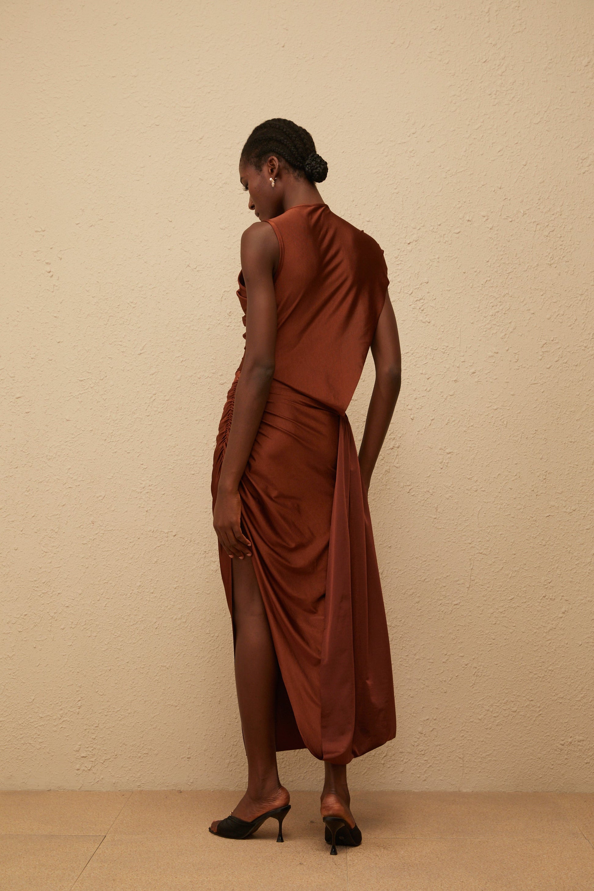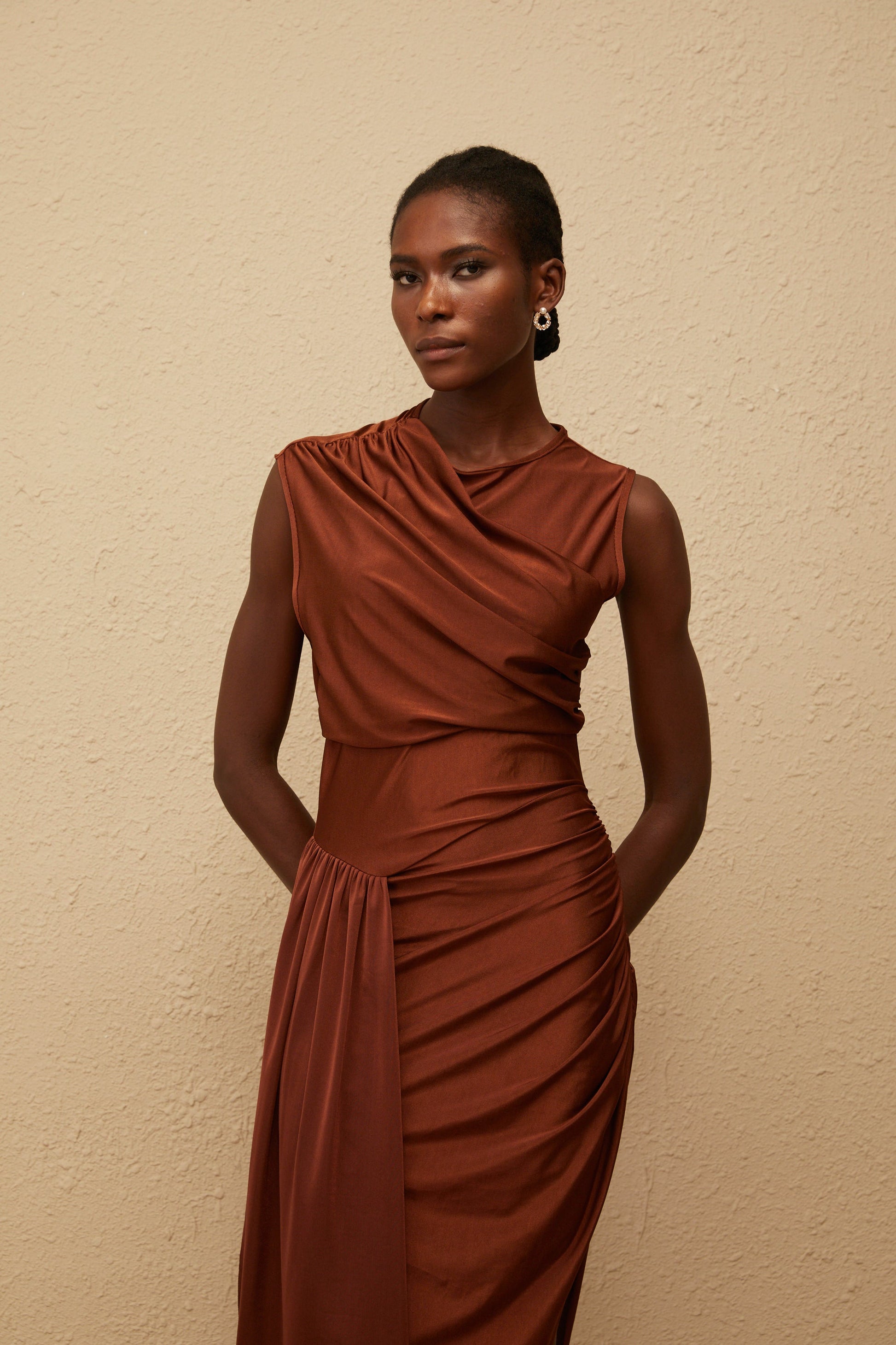 Reine Brown Asymmetrical Ruched Maxi Dress