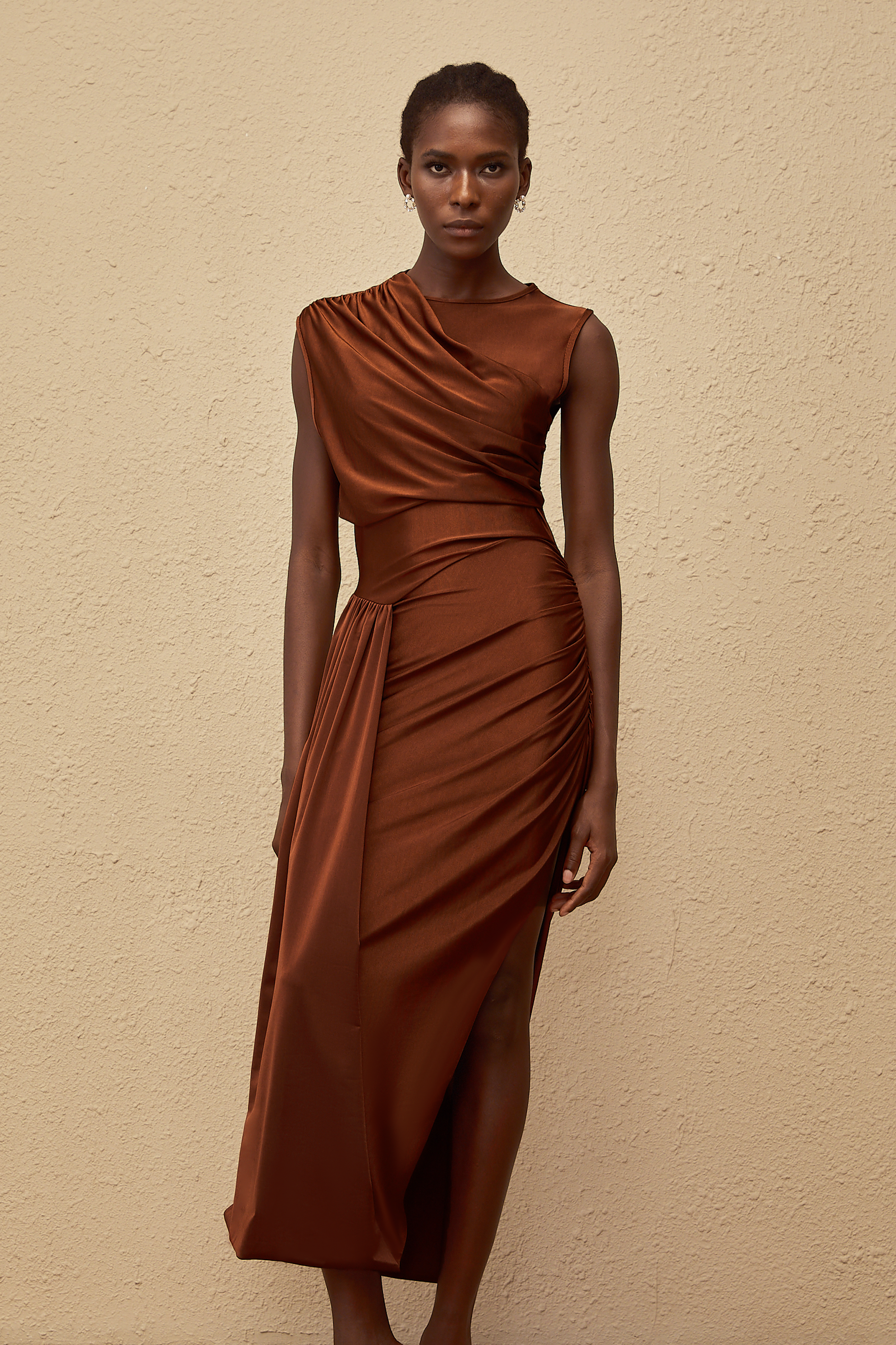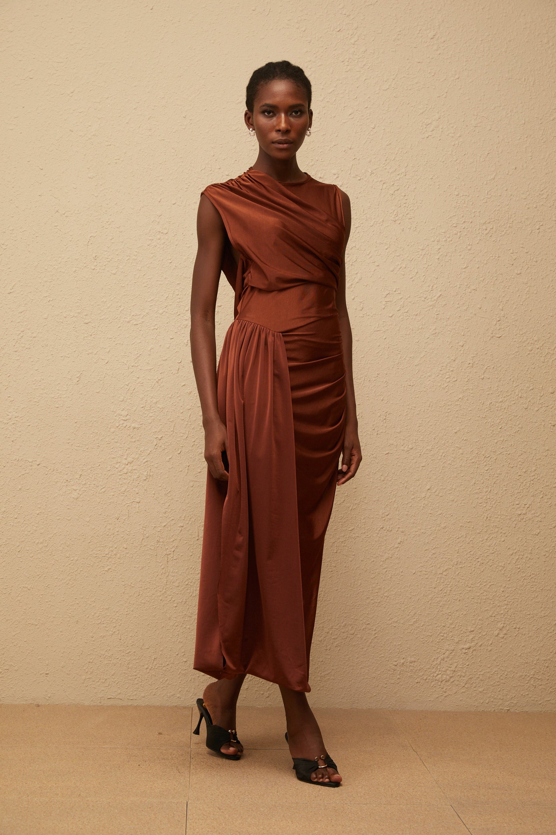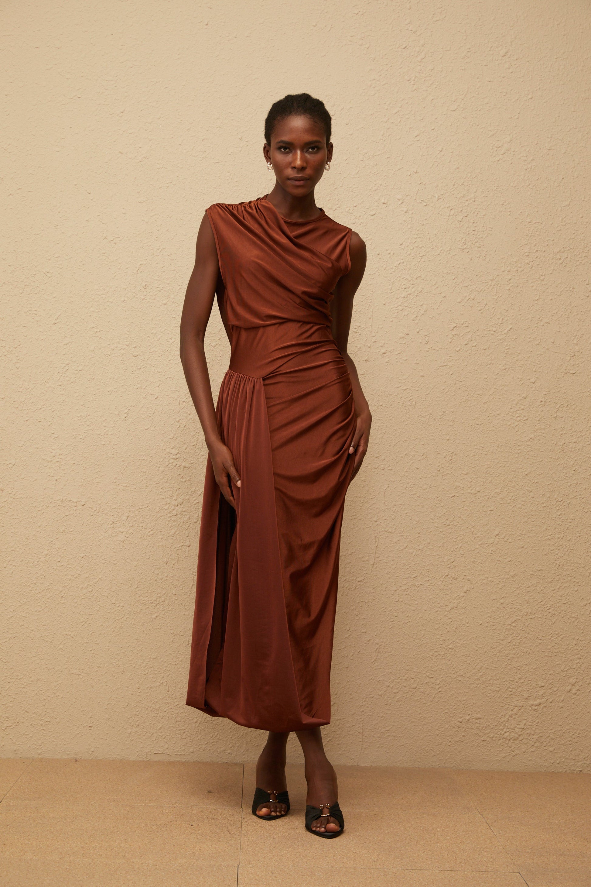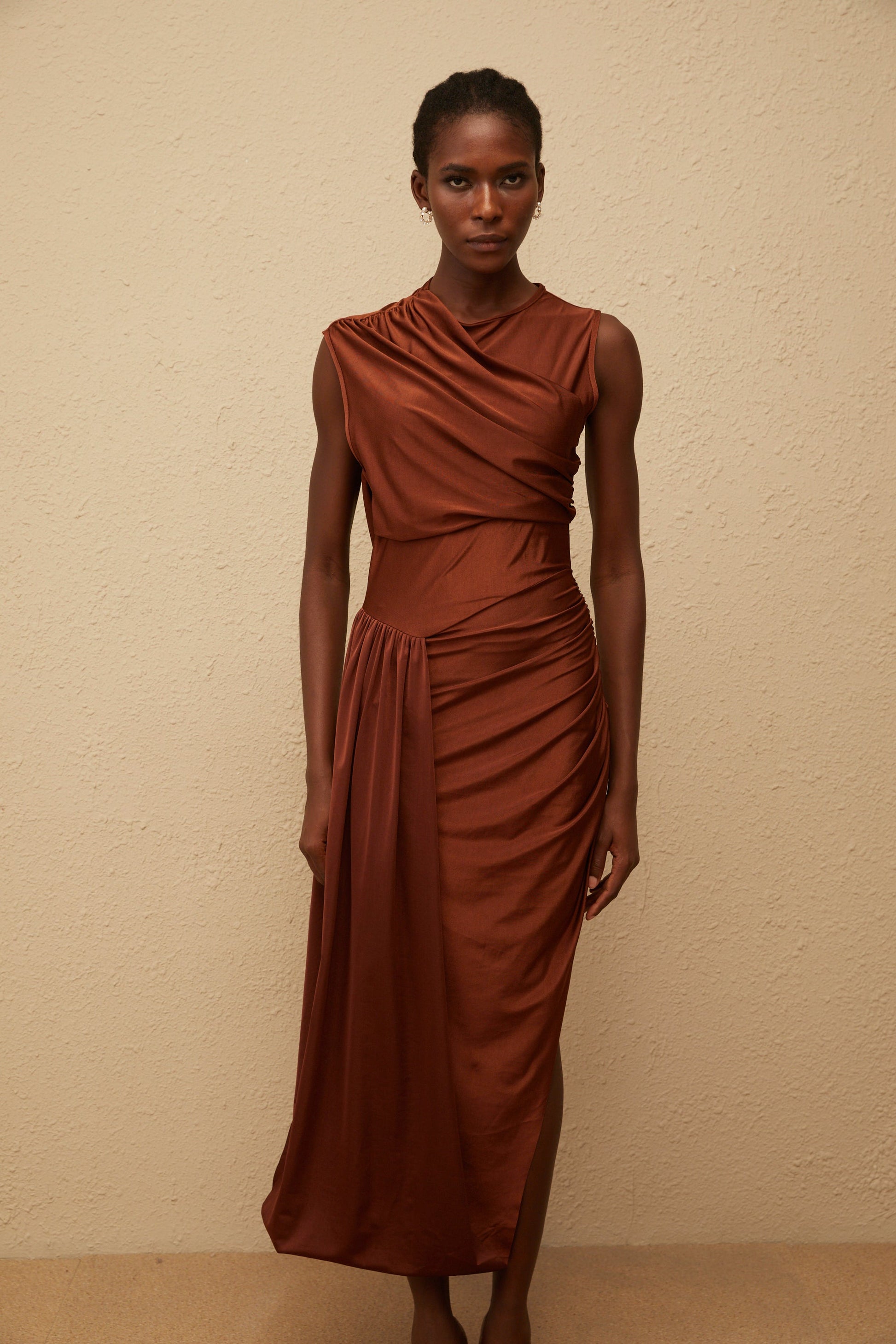 Reine Brown Asymmetrical Ruched Maxi Dress