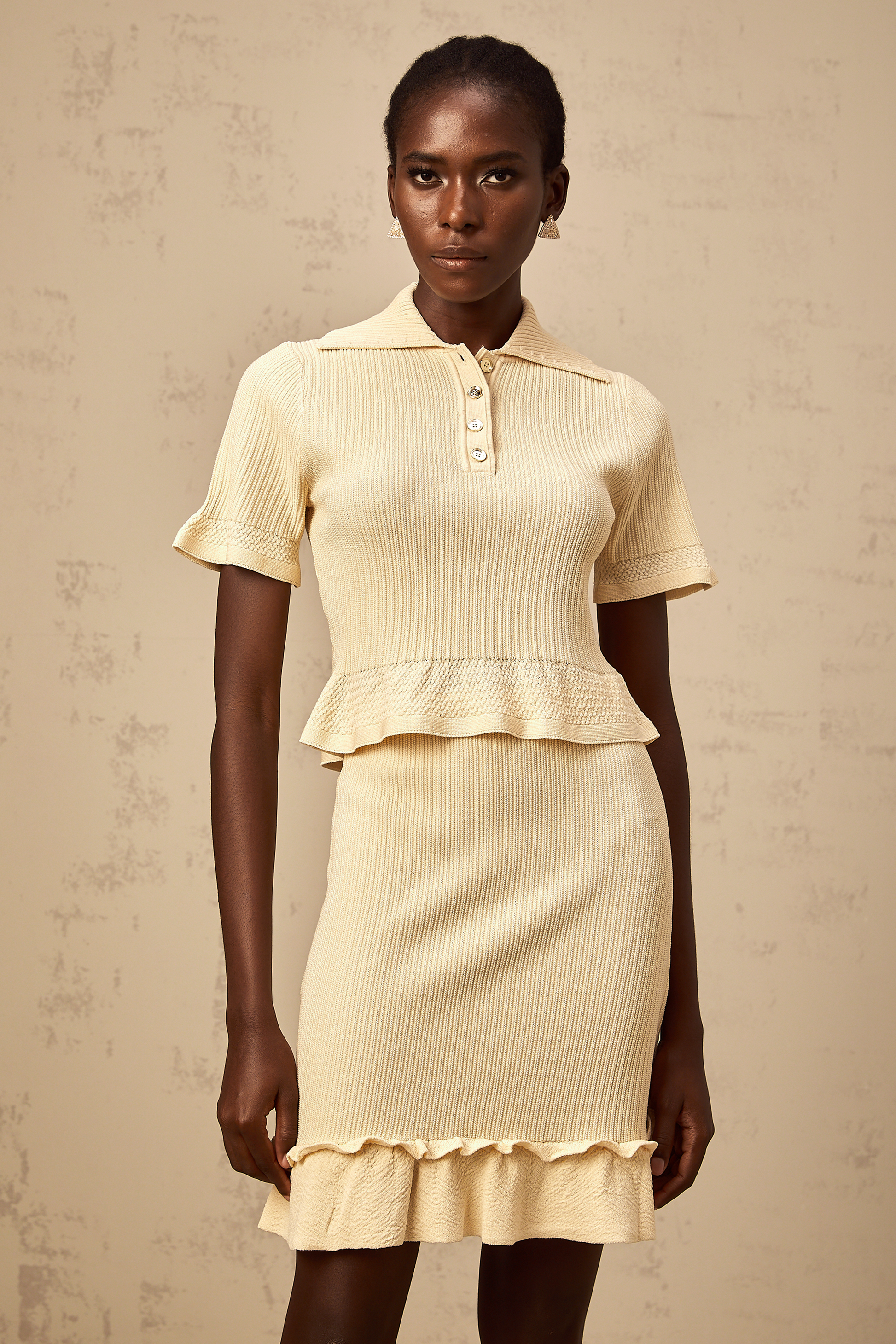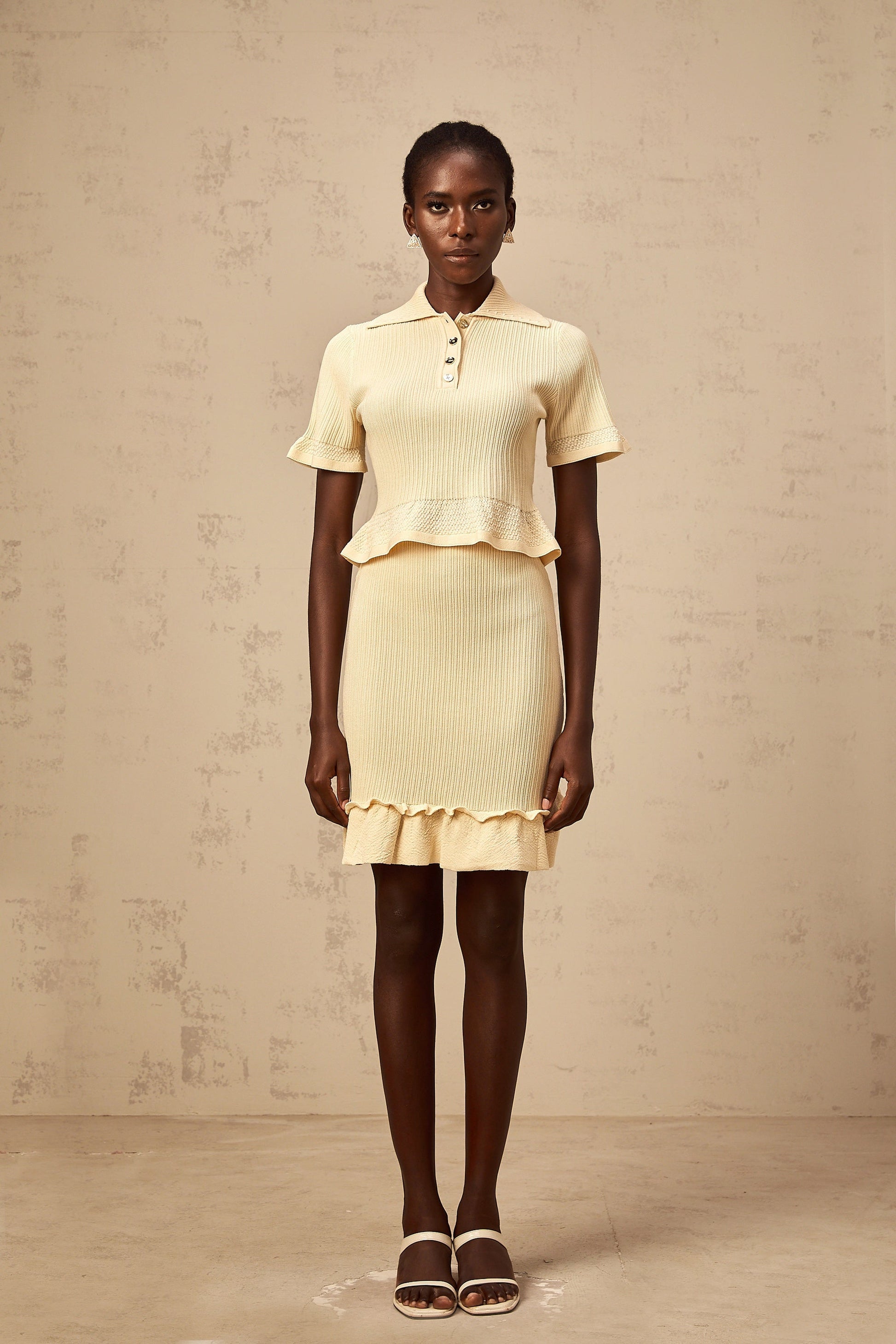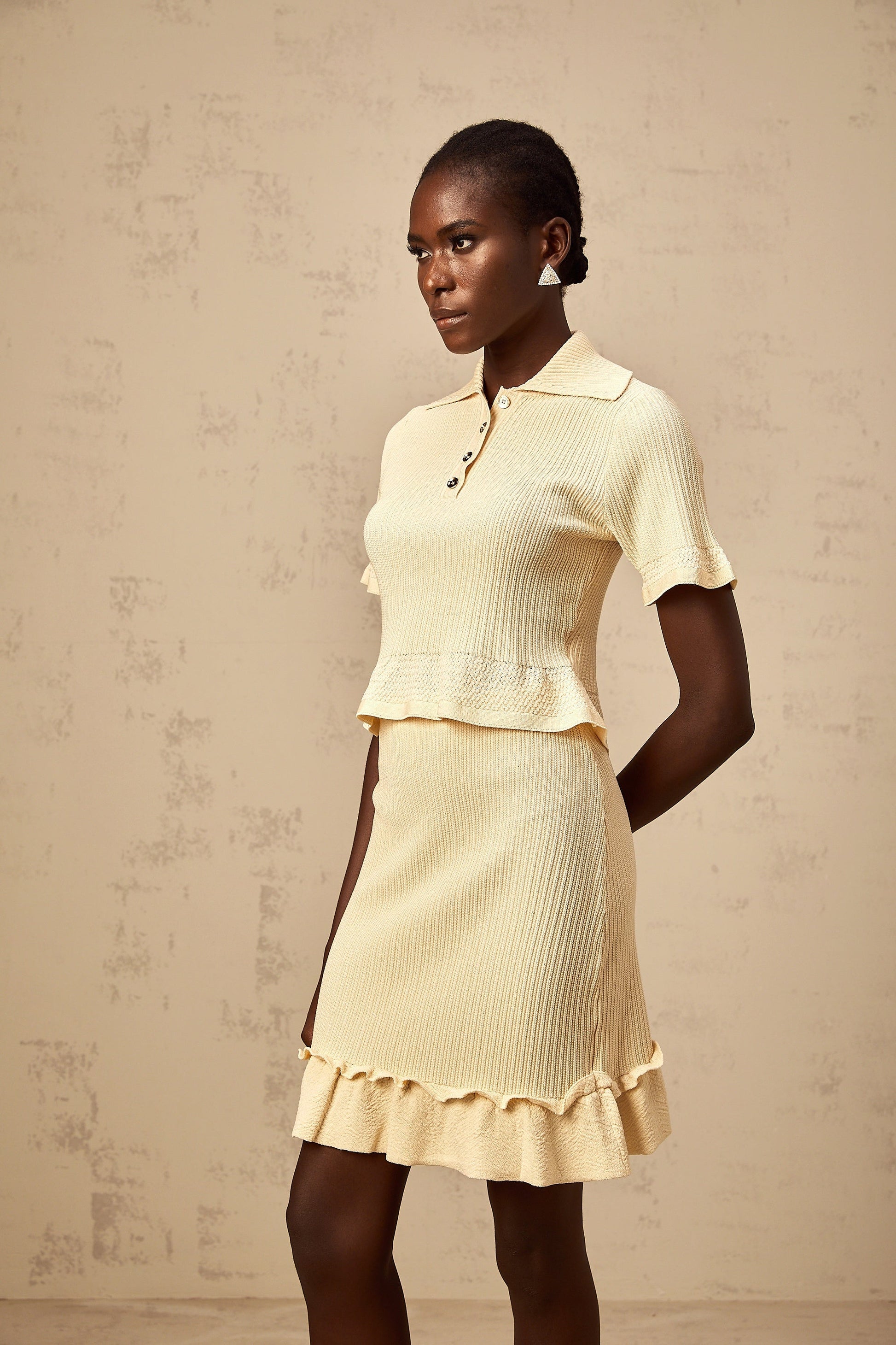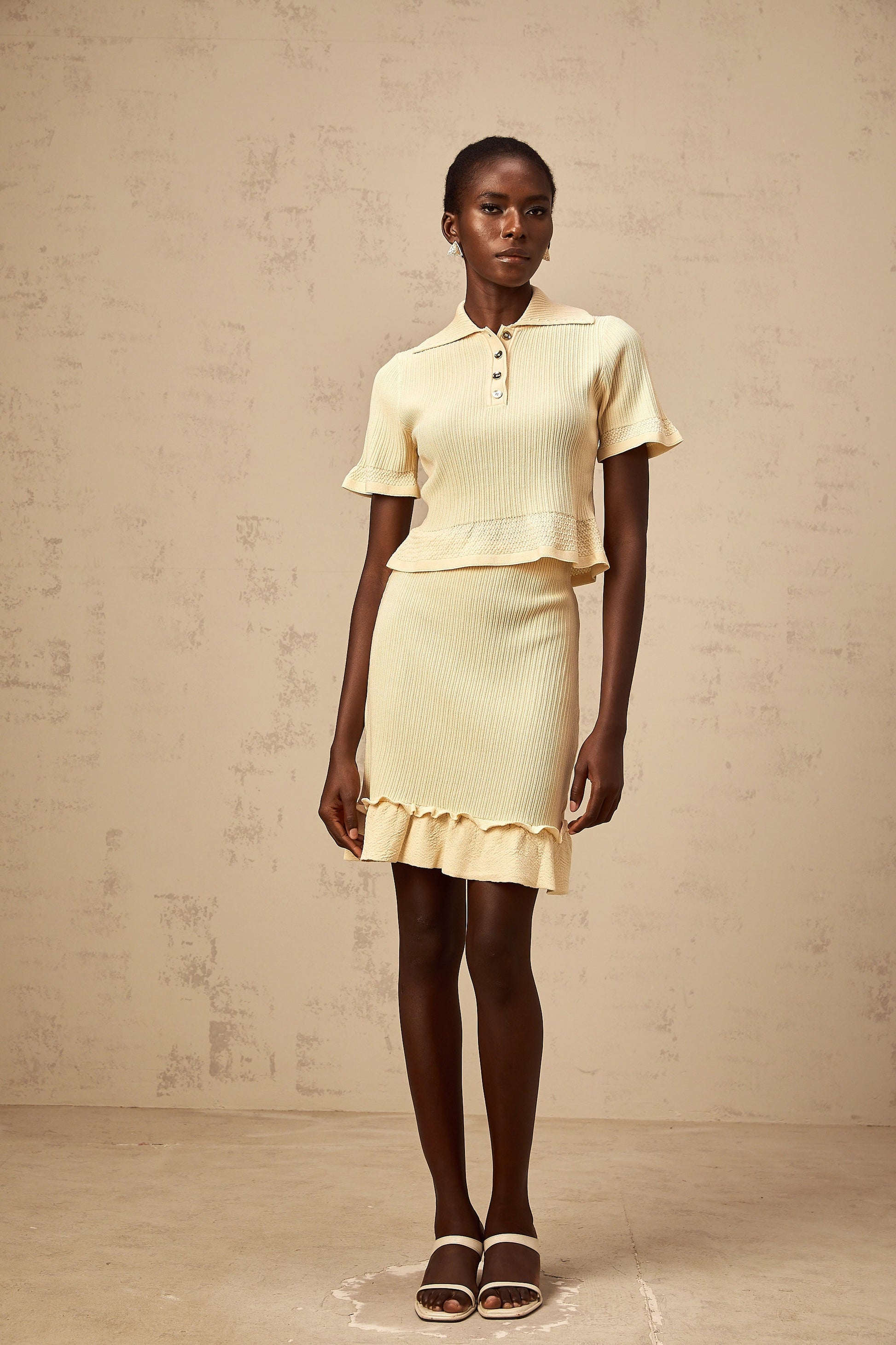 Reine yellow ruffled ribbed-knit top & skirt matching set