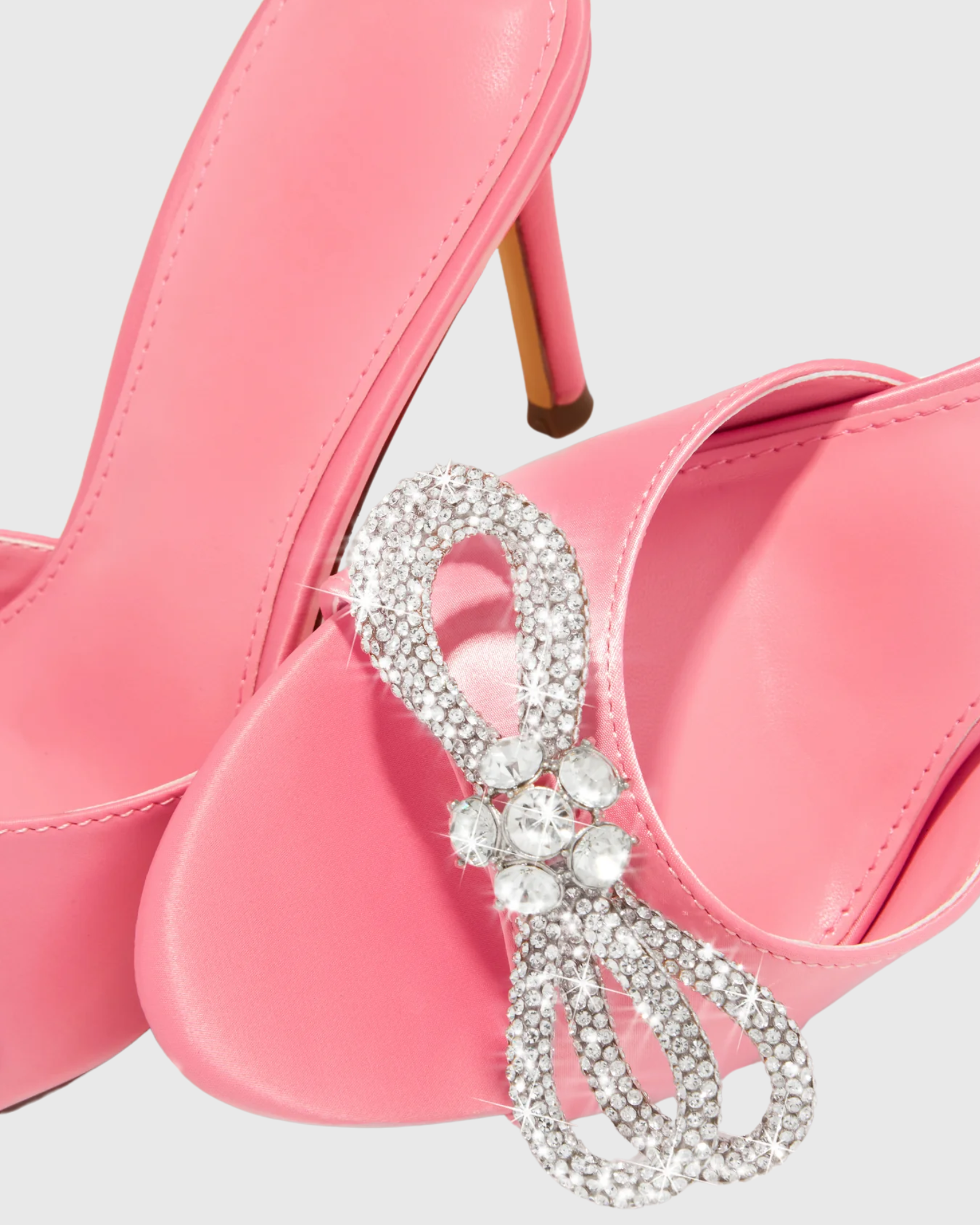 Step into elegance with the Rina Crystal Bow Satin Mules in Pink. These chic mules feature a delicate satin finish and a sparkling crystal bow that adds a touch of glamour to any outfit. Perfect for elevating your look from day to night, their comfortable design ensures you stay stylish without sacrificing ease. Make a statement with every step in these stunning, feminine shoes.