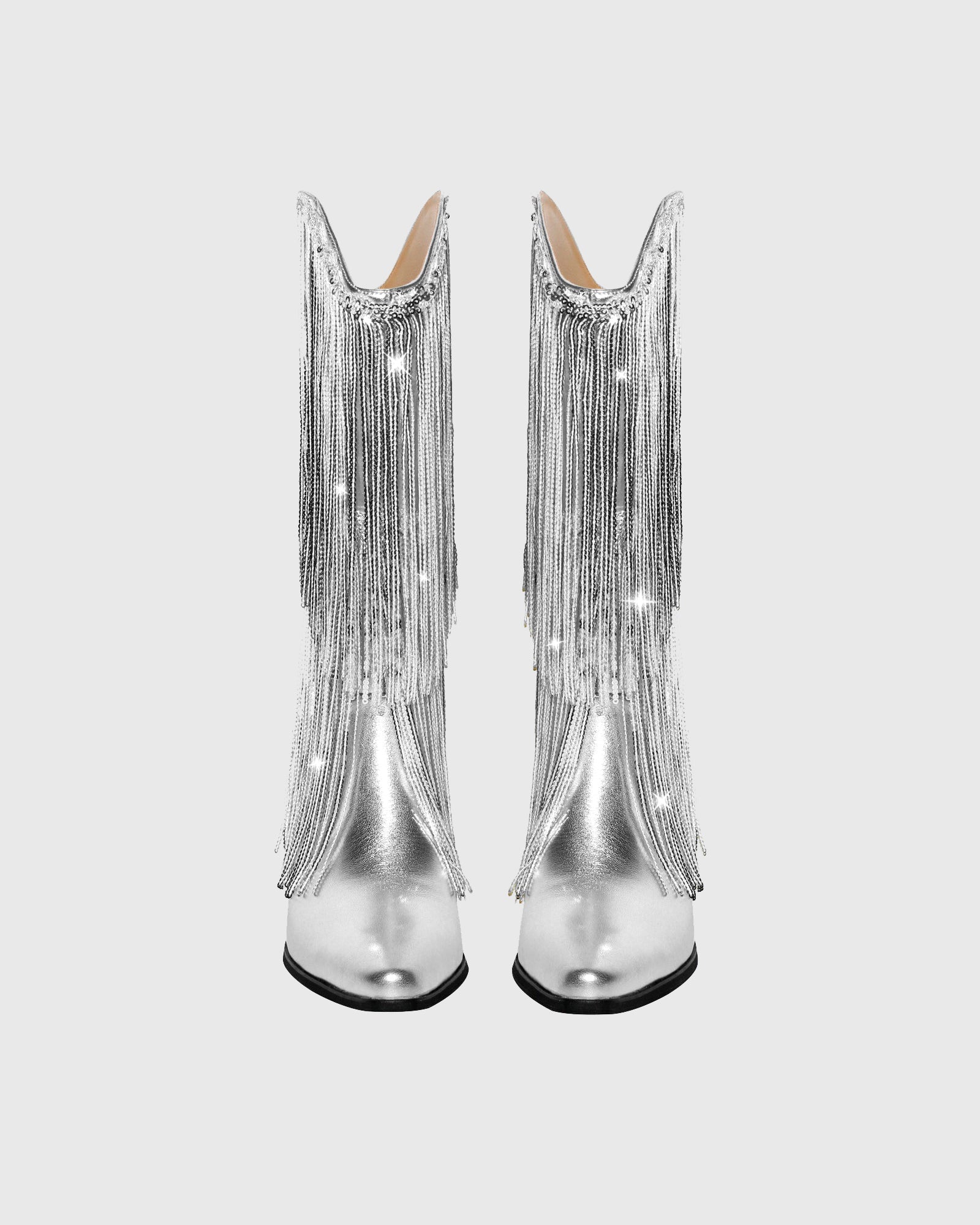 Elevate your style with our Rosana Rhinestone Fringe Leather Cowboy Mid Calf Boots In Silver! These stunning boots feature delicate rhinestones and fringe detailing, adding a touch of glamour to any outfit. Made with high-quality leather, they offer both style and comfort. Step out in confidence and turn heads with these silver boots.