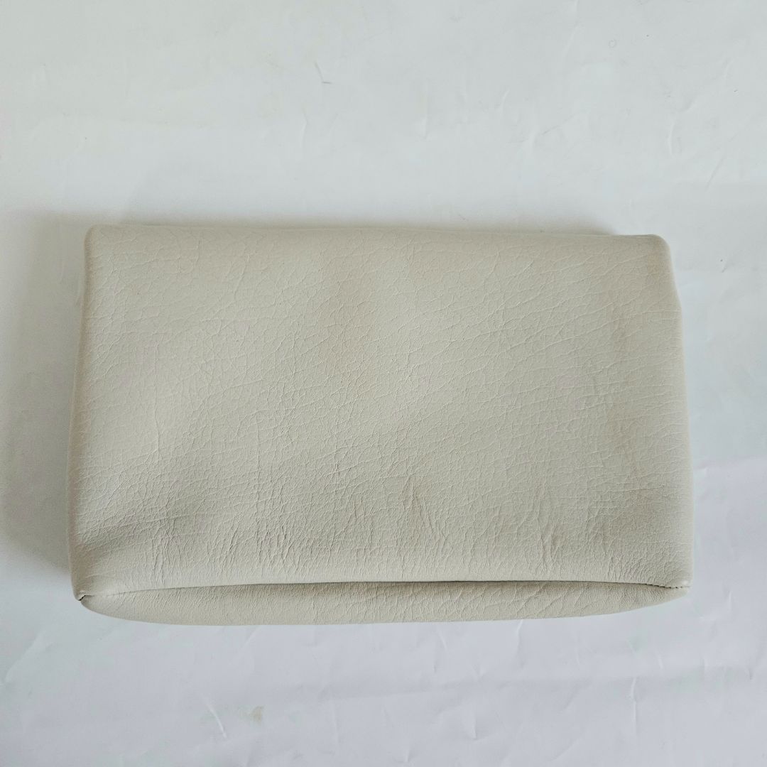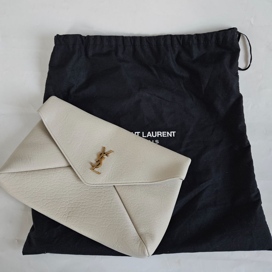 The Saint Laurent Large Cassandre Envelope Pouch in white lambskin leatherCrafted from high-quality lambskin, this pouch features a front flap with an origami-inspired design and is adorned with the iconic YSL monogram in bronze-toned hardware.
