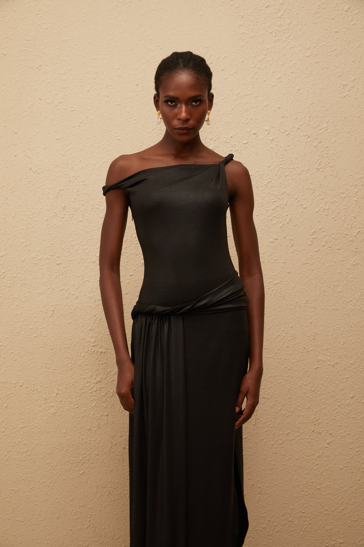 Samantha Black Asymmetrical Gathered Maxi Dress
