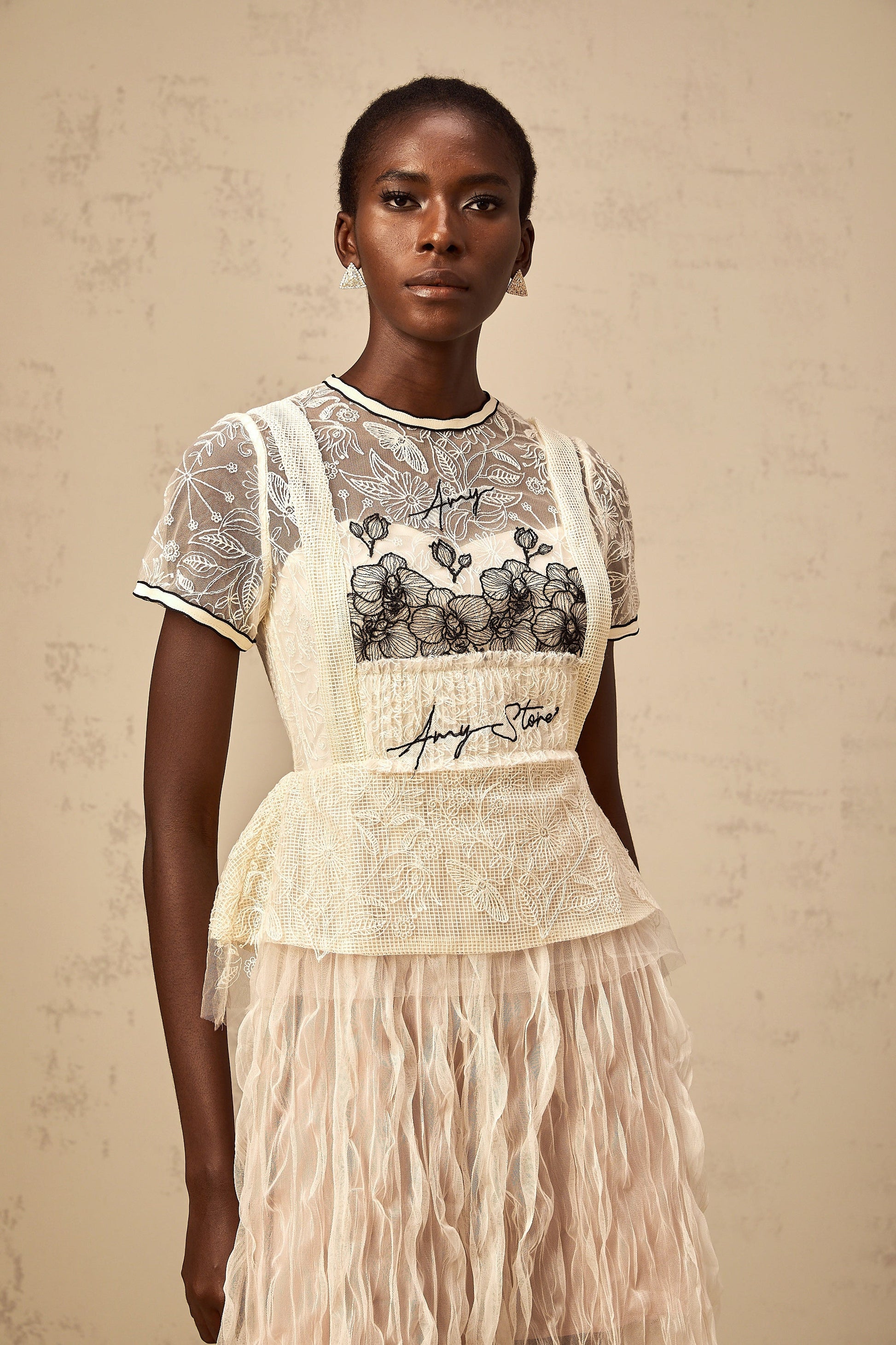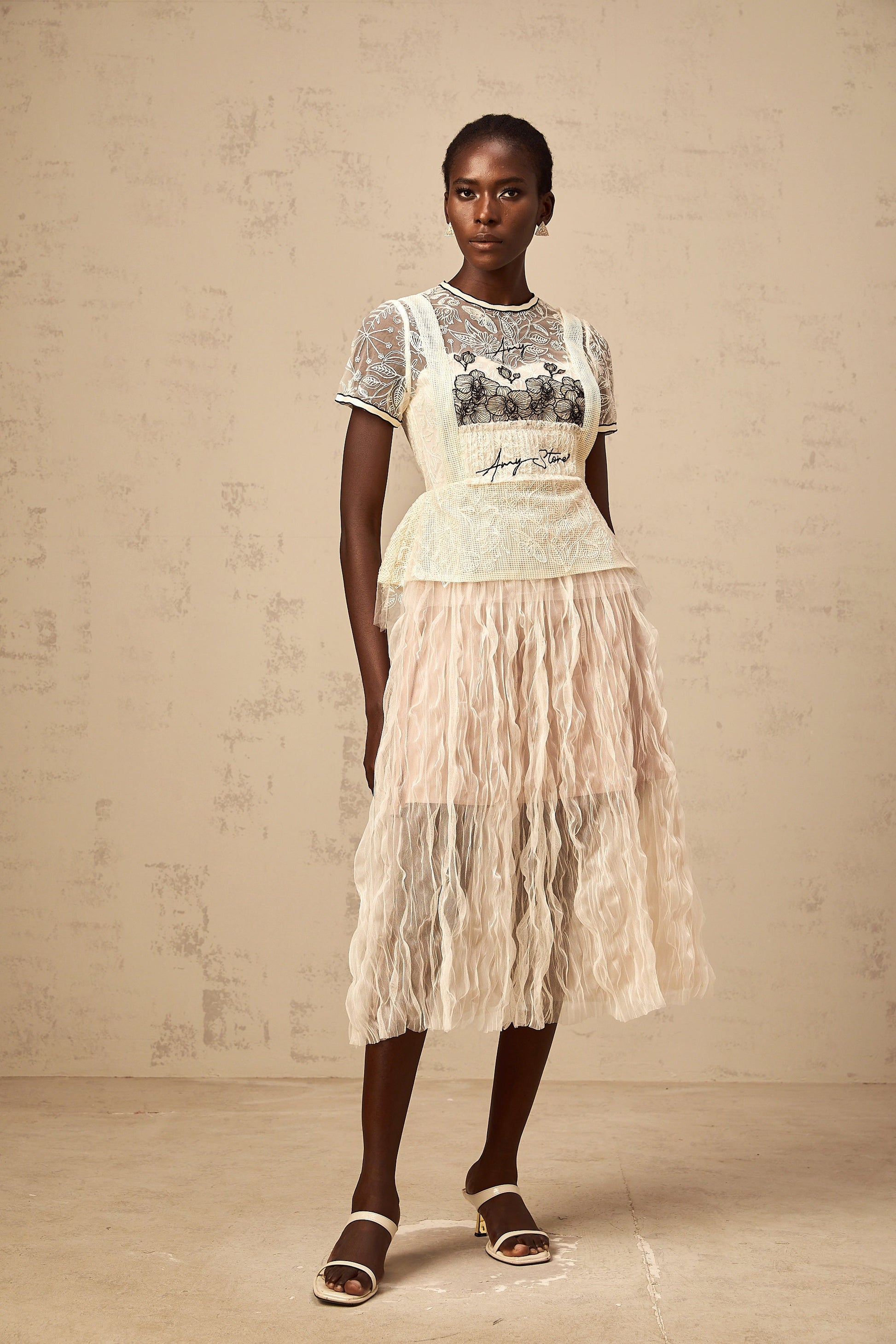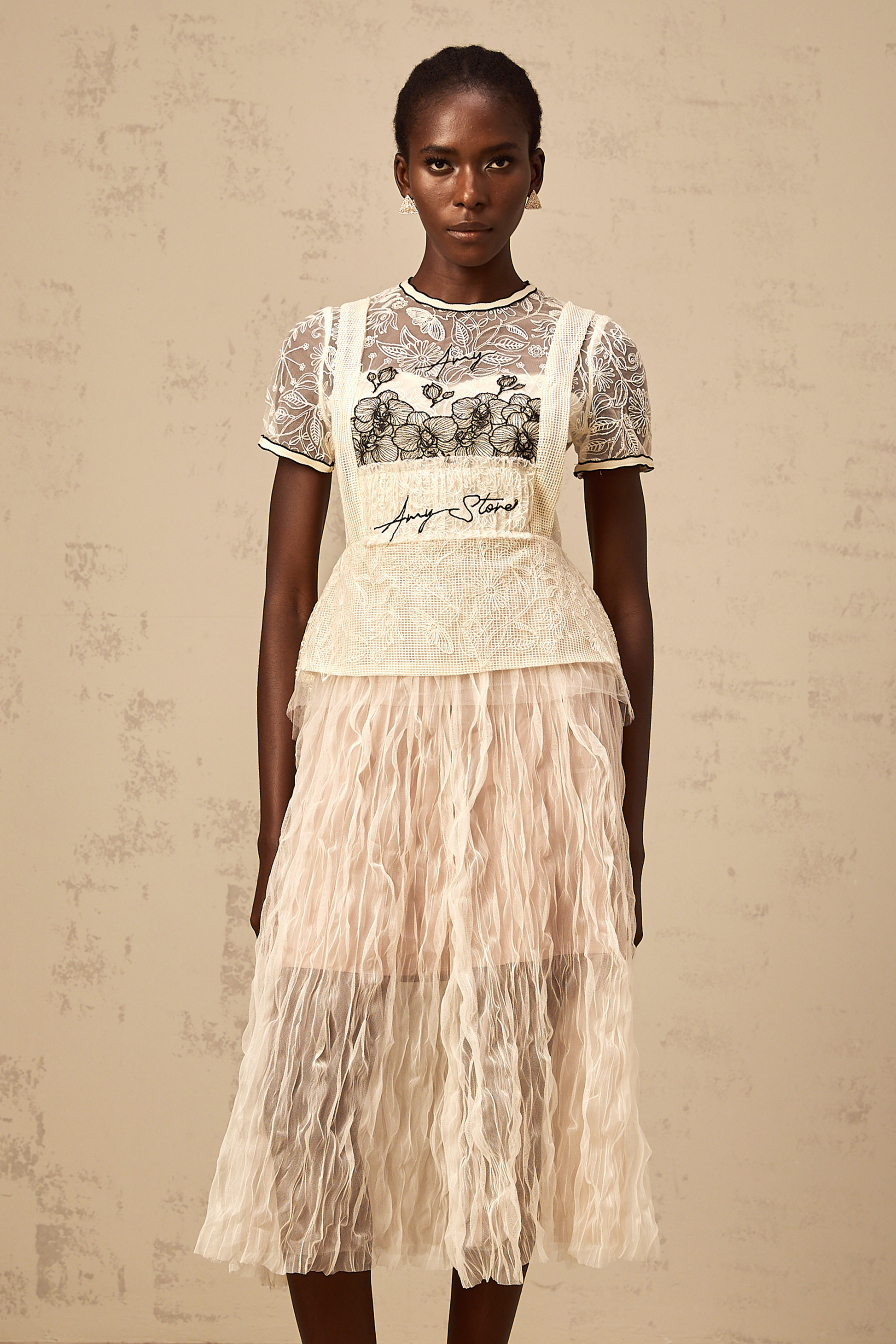 Sandrine beige embroidered tulle midi dress