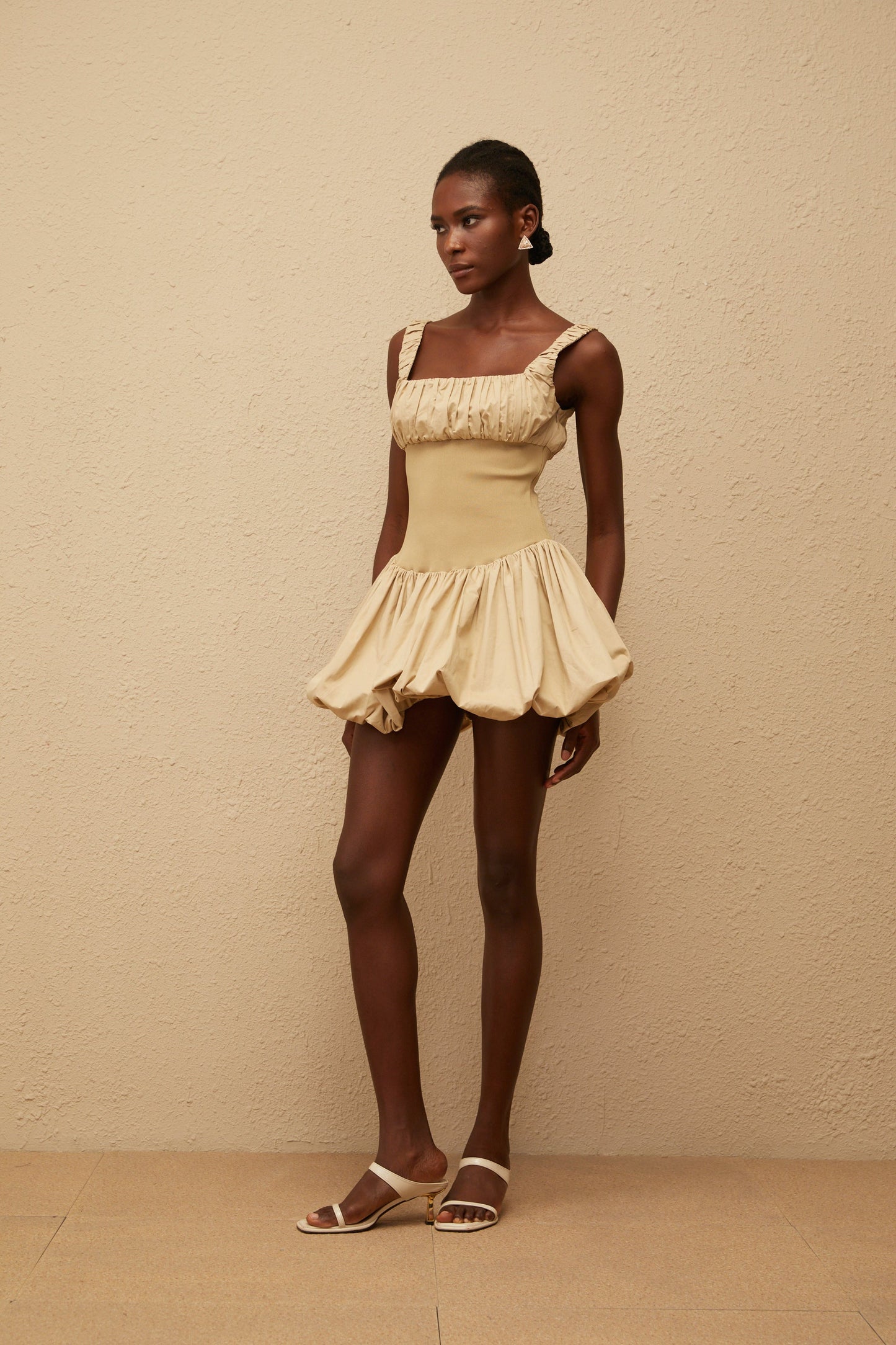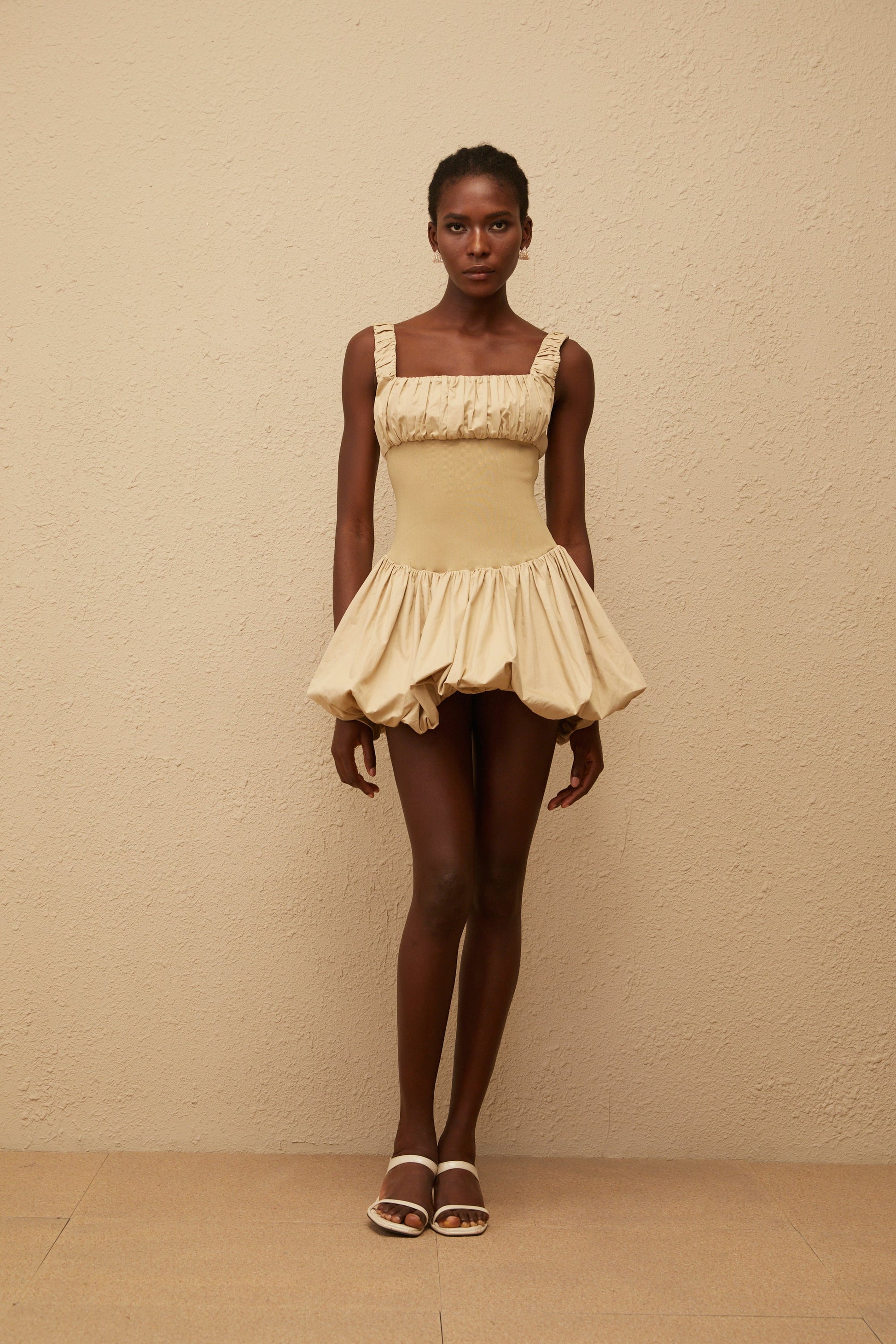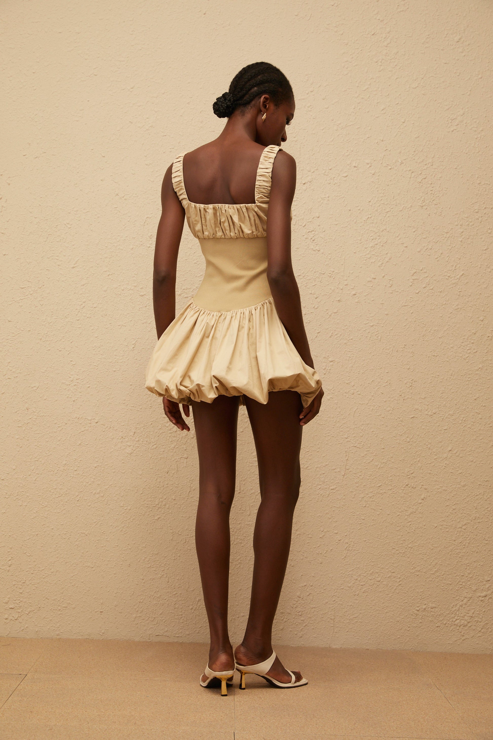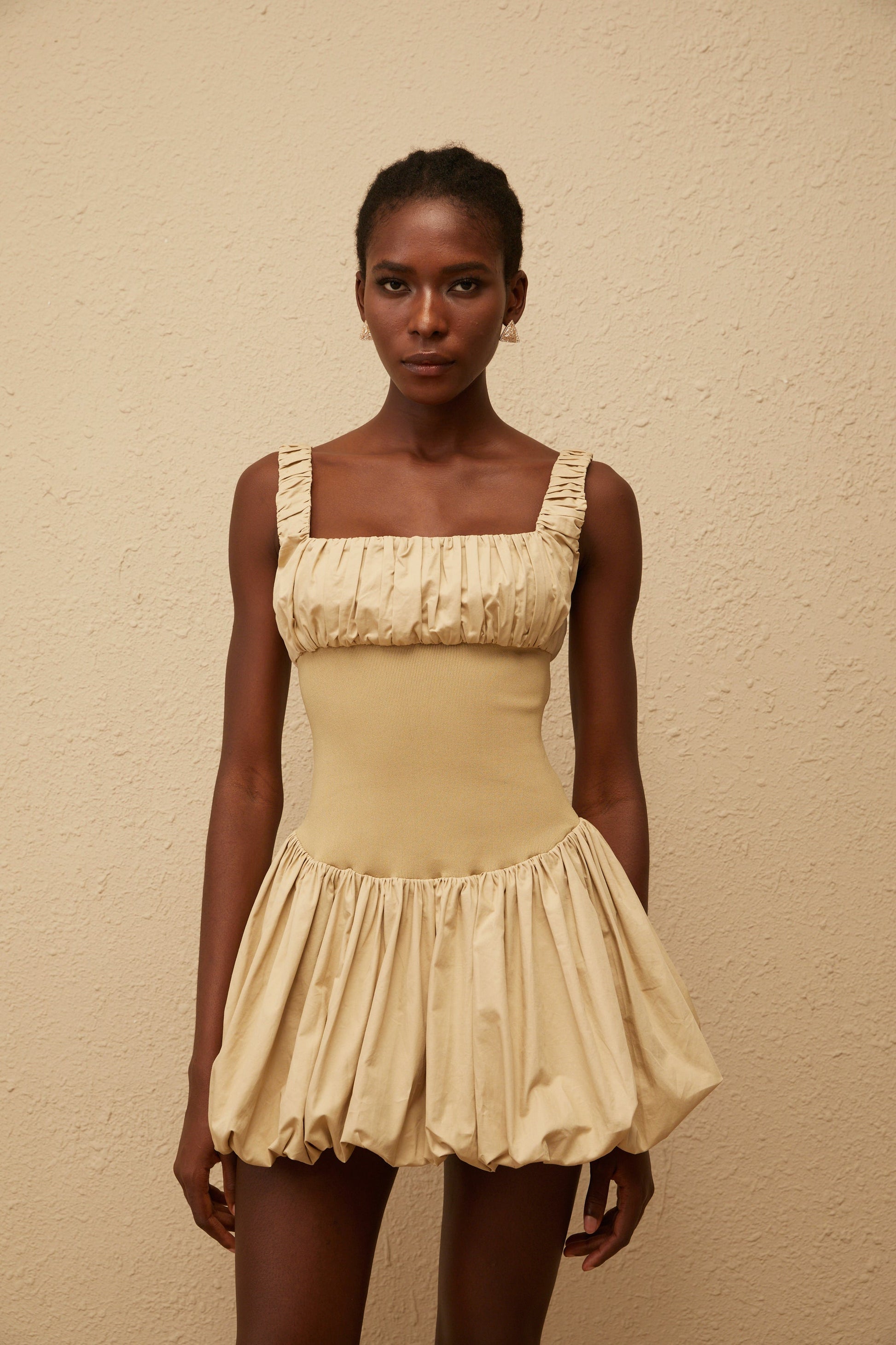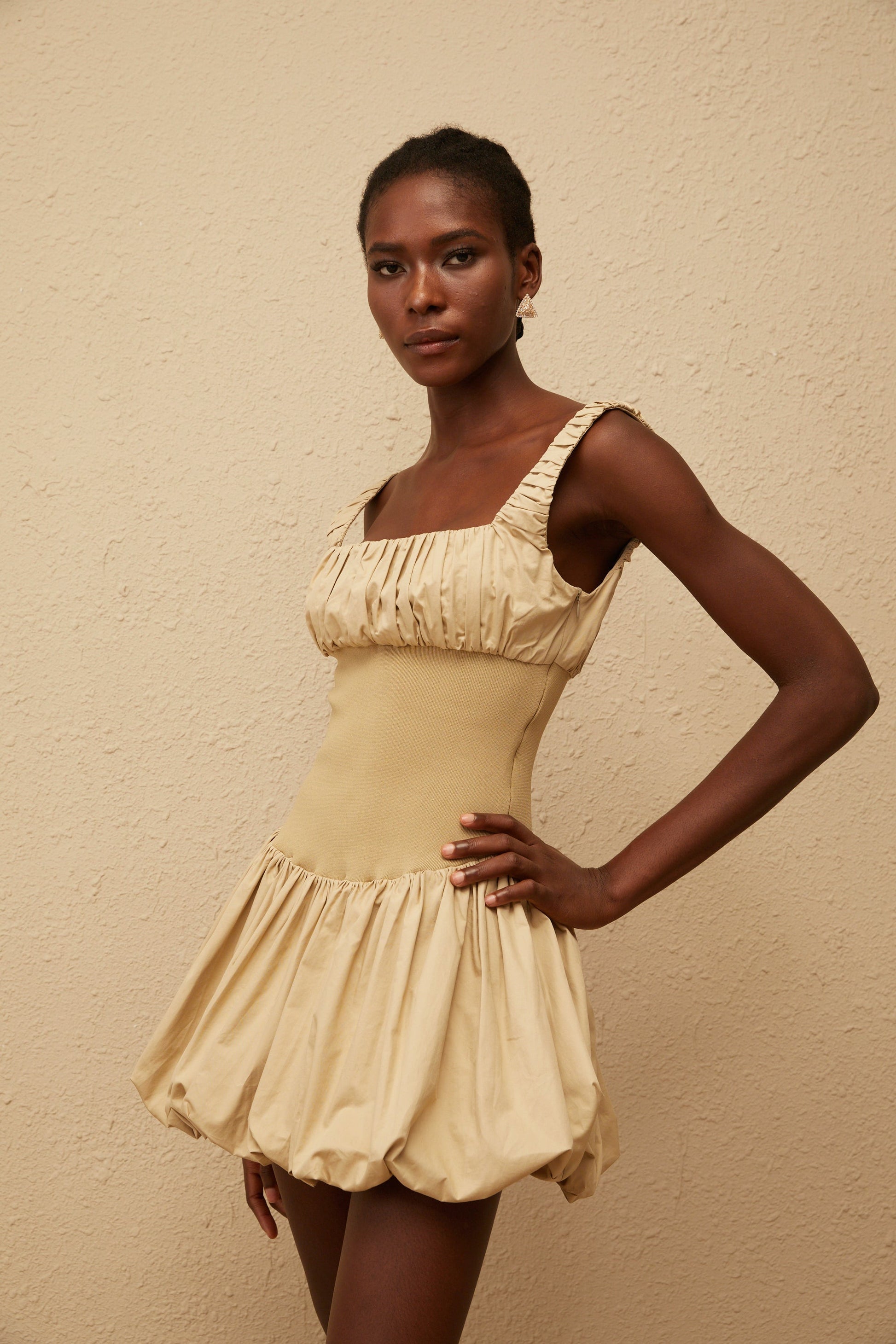Sandrine Khaki Shirred Bubble Hem Mini Dress