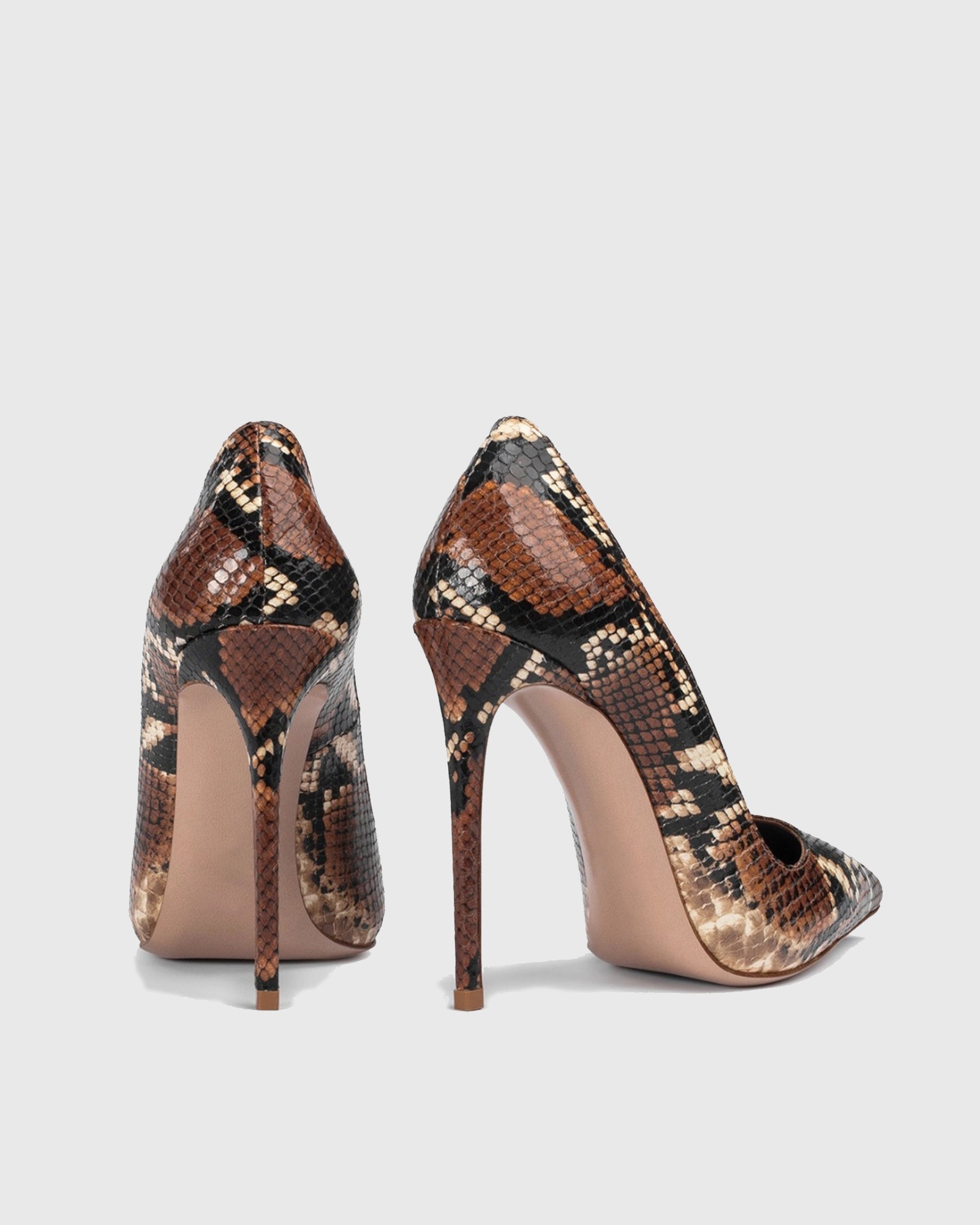 Elevate your style with the Sanja Snake Print Pumps in Brown. These pumps feature a trendy snake print design that adds a touch of edginess to any outfit. With a comfortable and versatile brown color, you can easily transition from day to night. Step out in confidence and make a statement with these pumps!