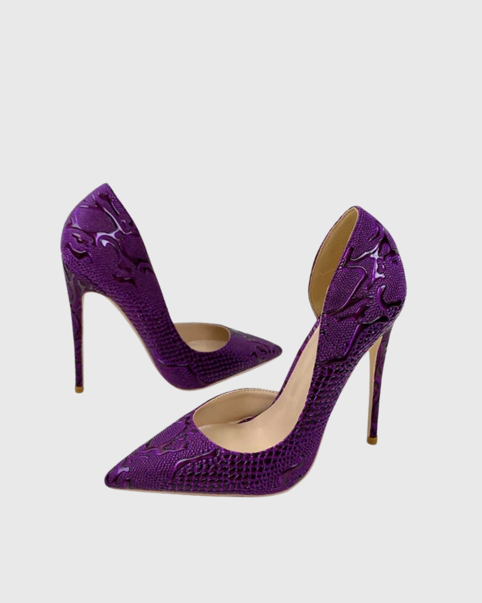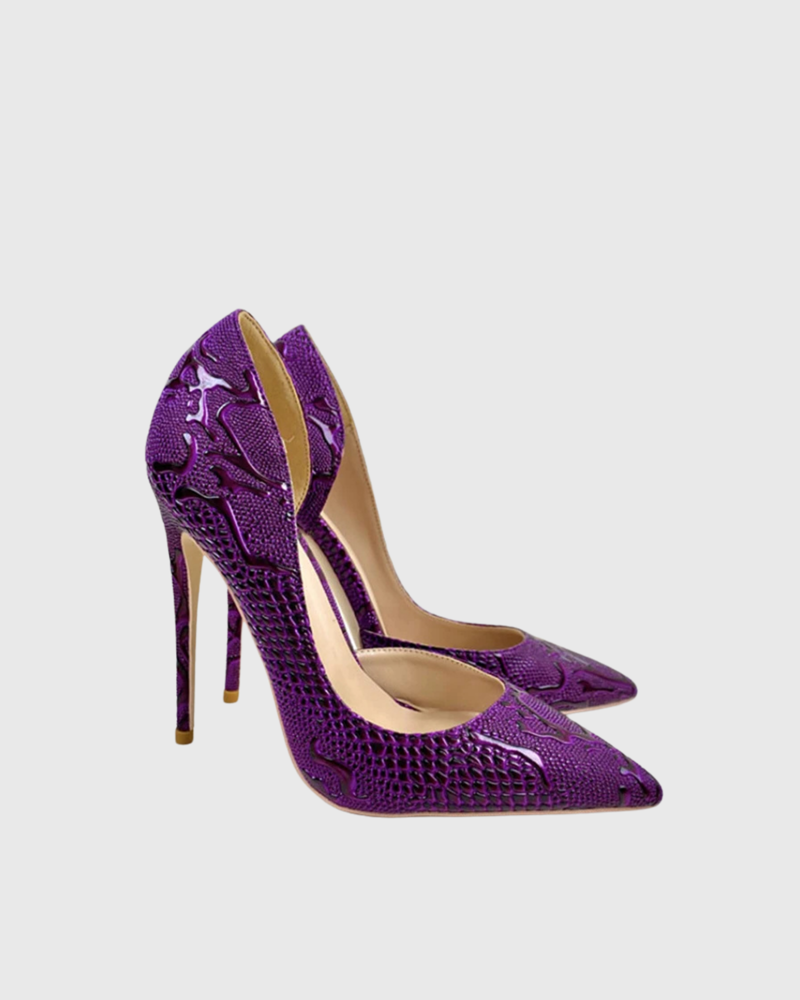 Elevate your style with Sarla Vintage Snake Texture Pumps. These statement shoes feature a unique snake texture that adds a touch of exotic flair to any outfit. Step confidently with the added stability of a classic pump design. Make a statement and turn heads with every step!