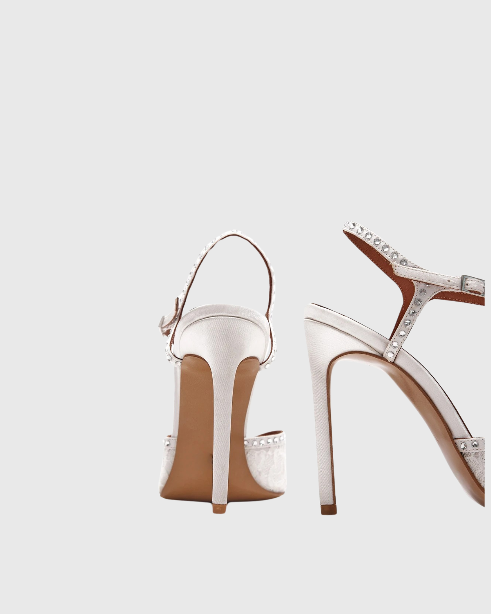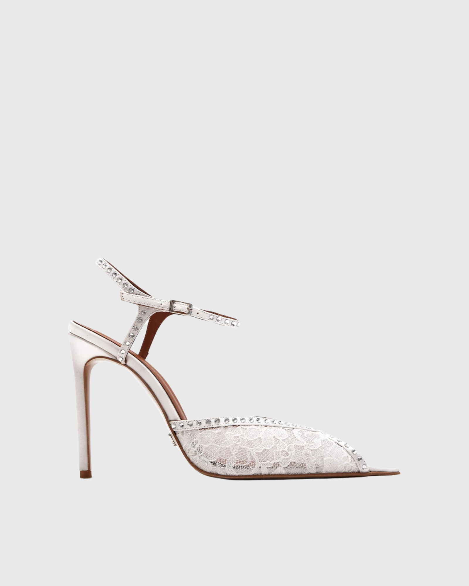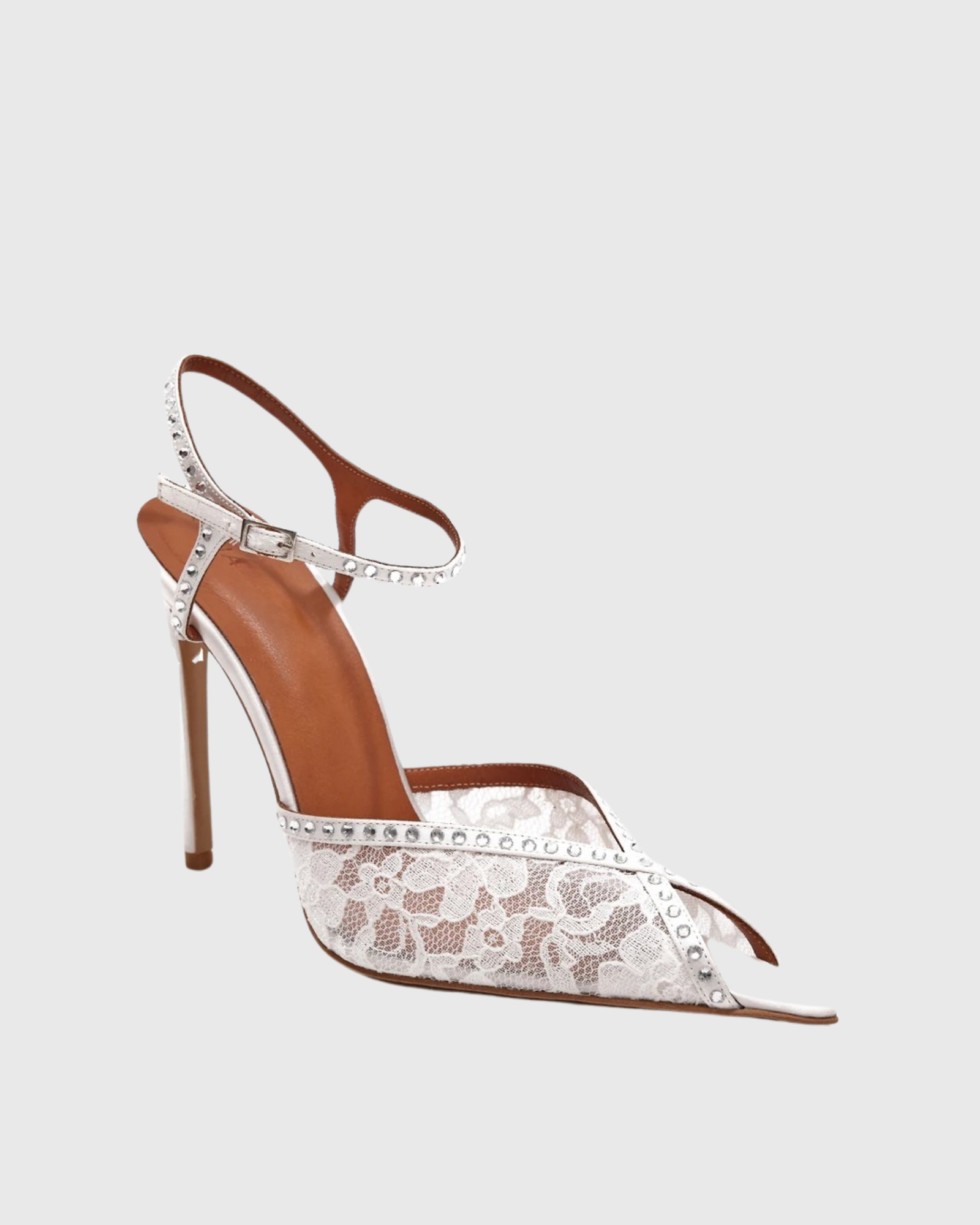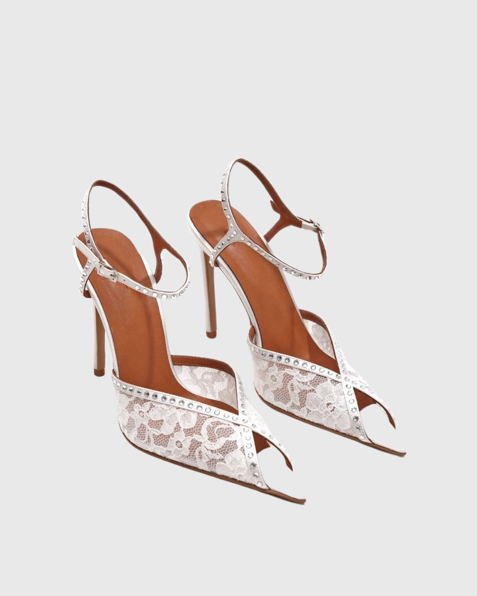 Step into luxury and style with the Sarva Lace Rhinestone Strap Pumps. These beautiful pumps feature a delicate lace design and sparkling rhinestone strap, perfect for any special occasion. Be the belle of the ball in these stunning white pumps that will elevate any outfit with elegance and glamour.