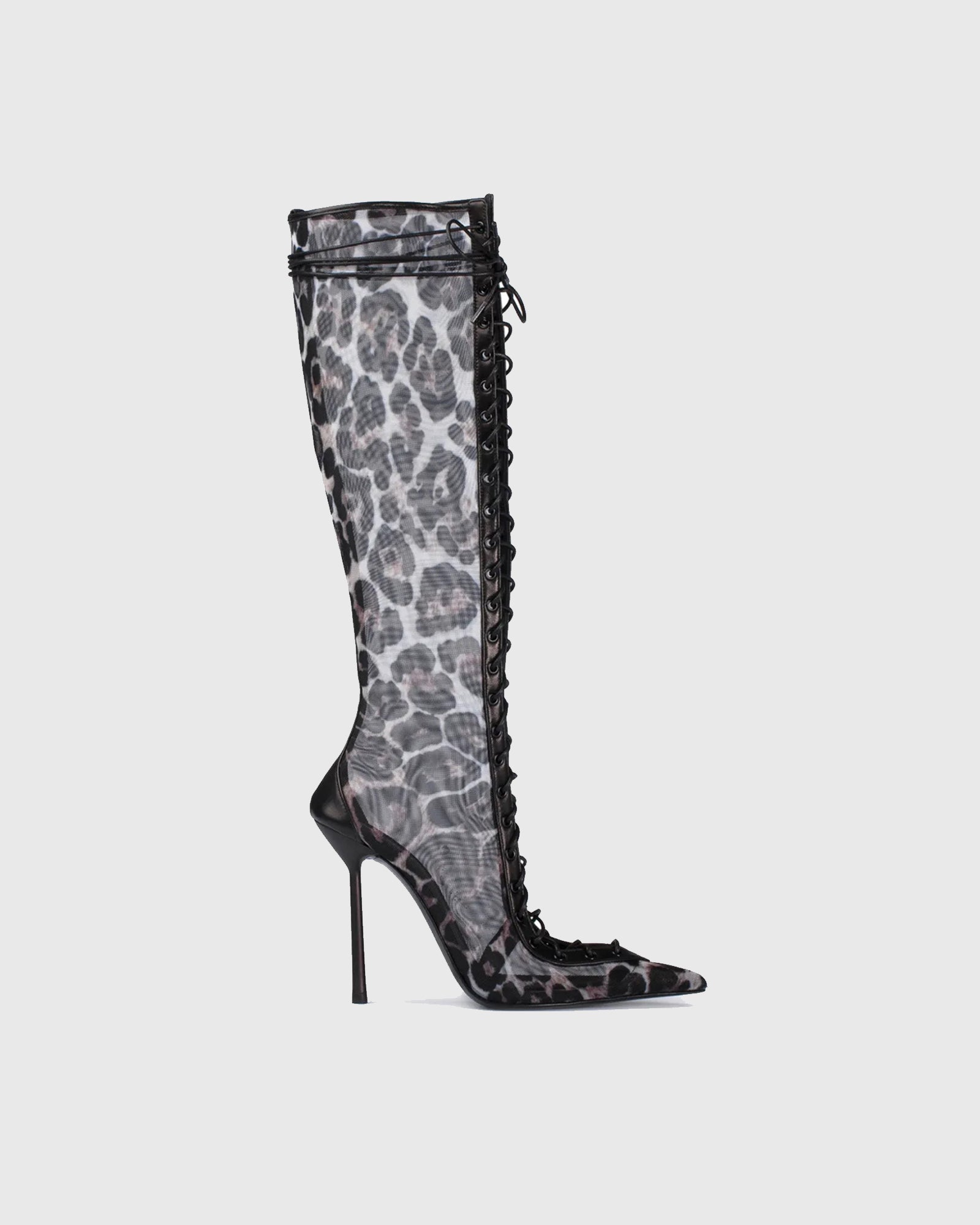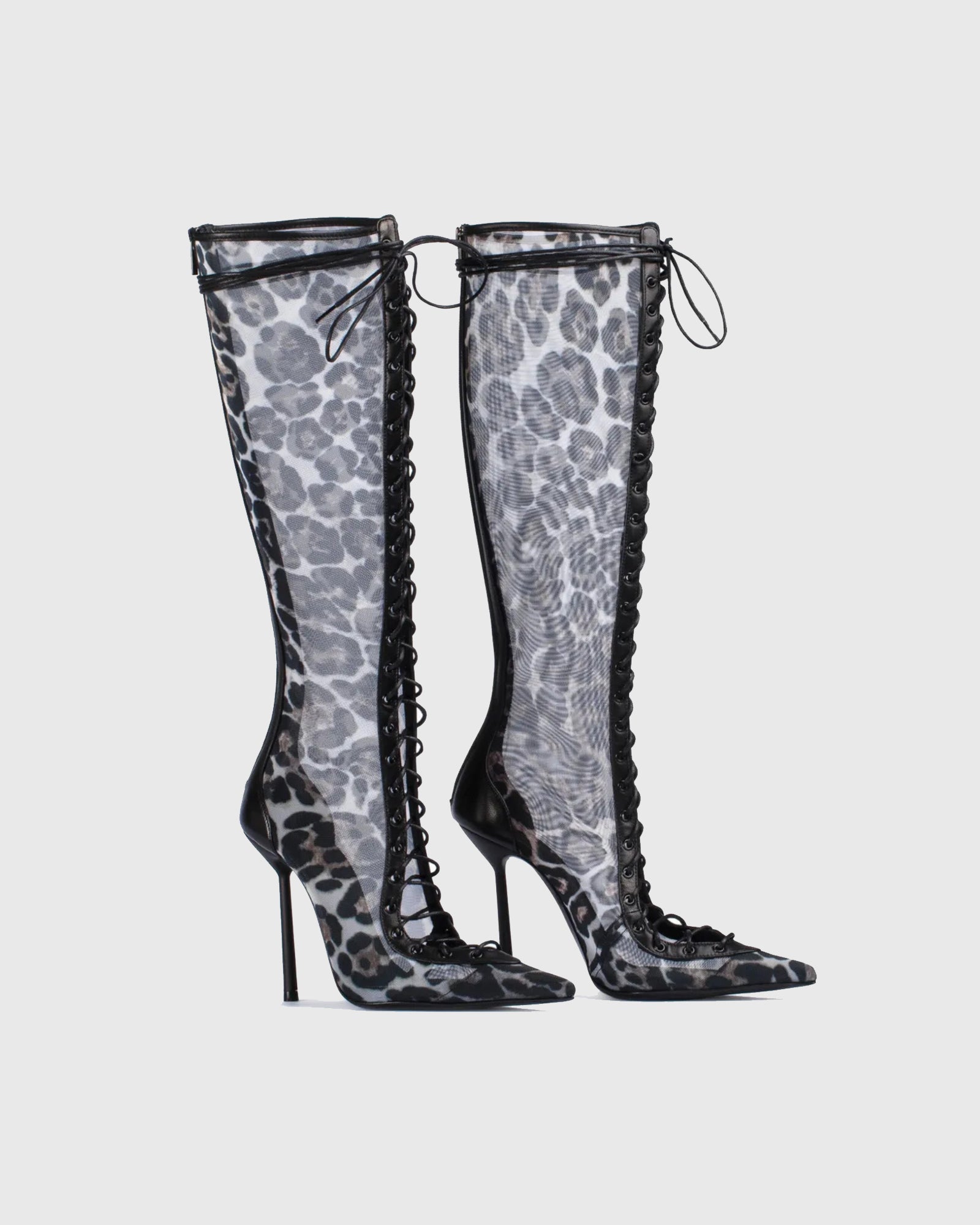 Sea Leopard Print Mesh Lace Up Knee High Boots