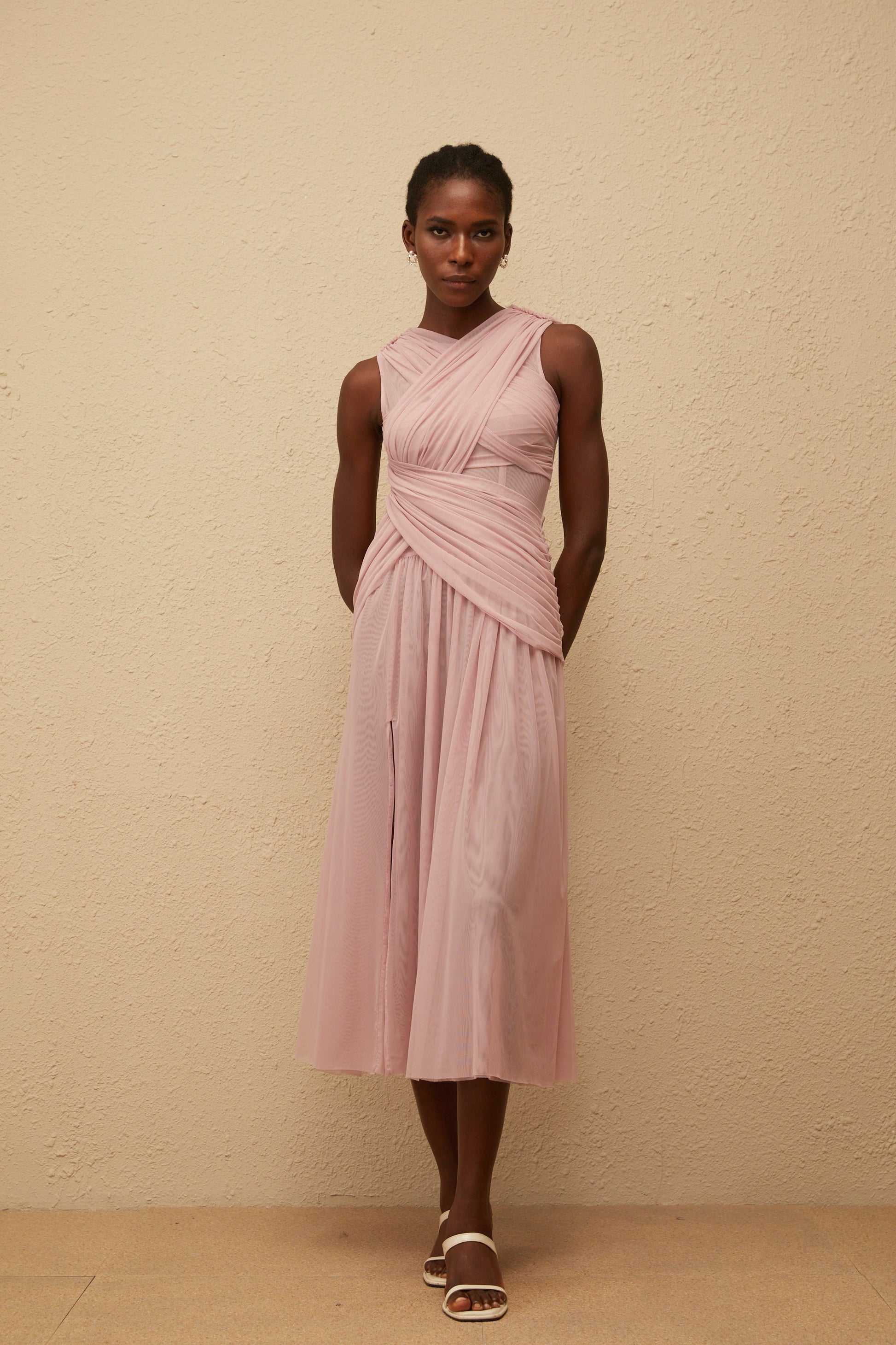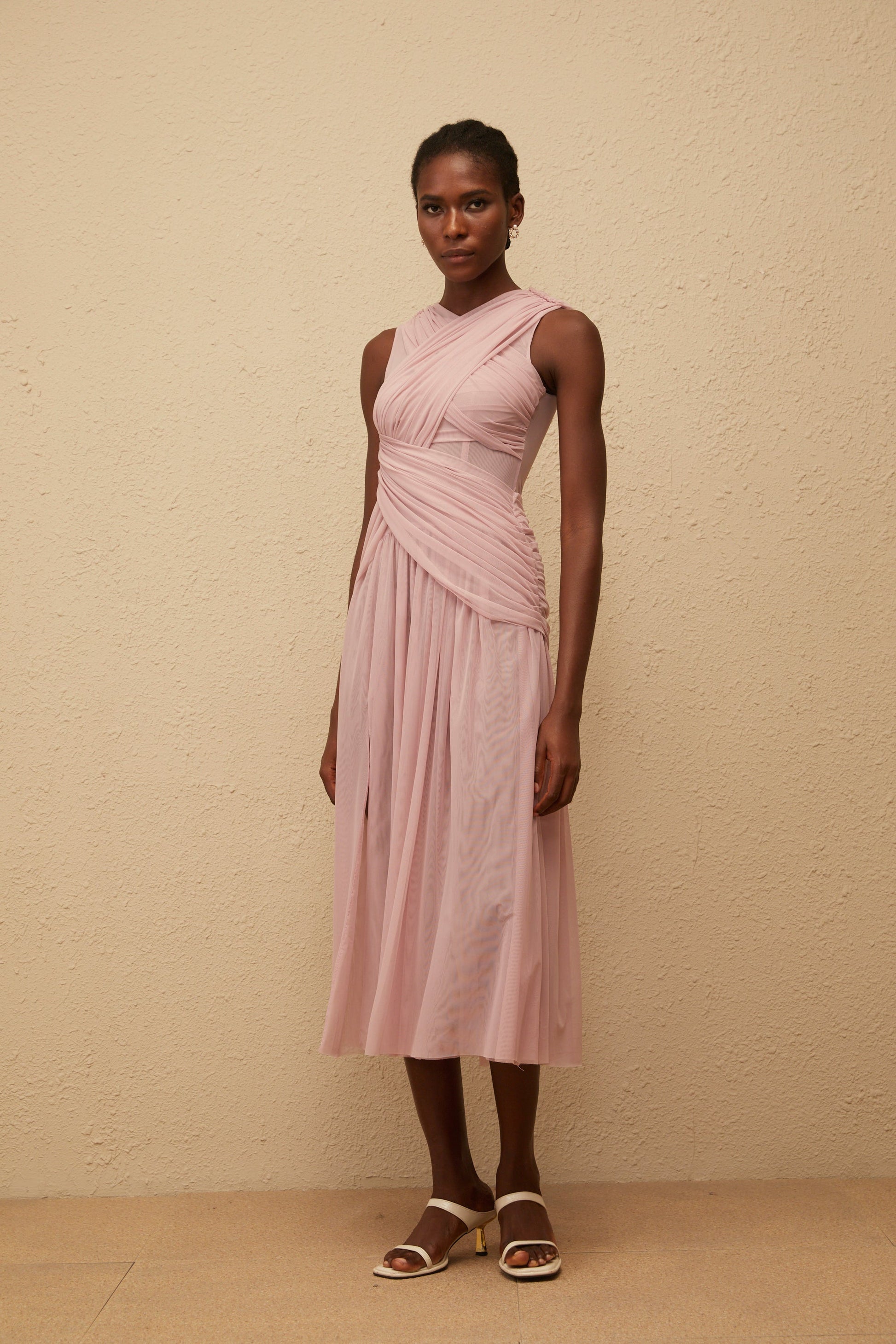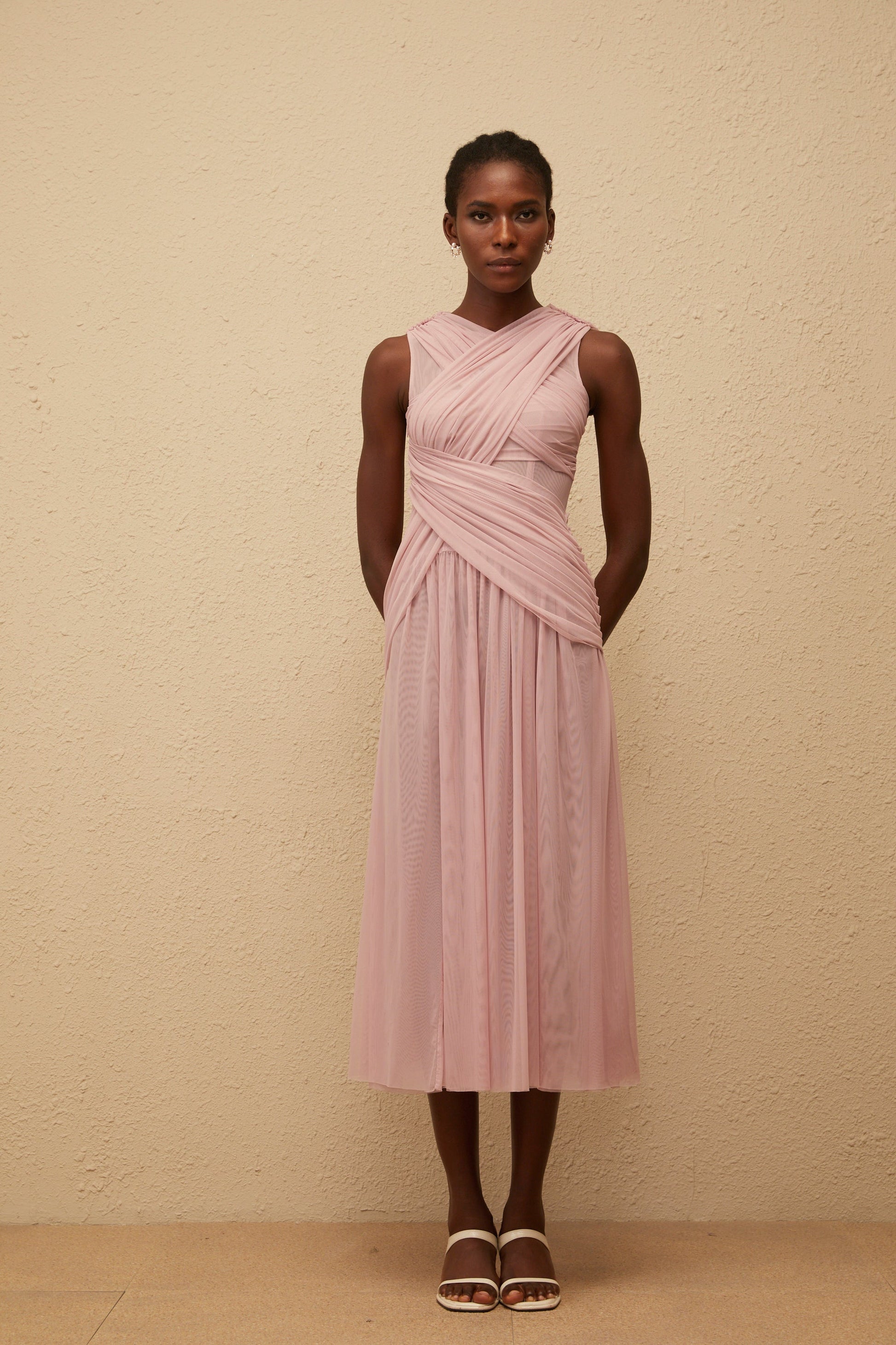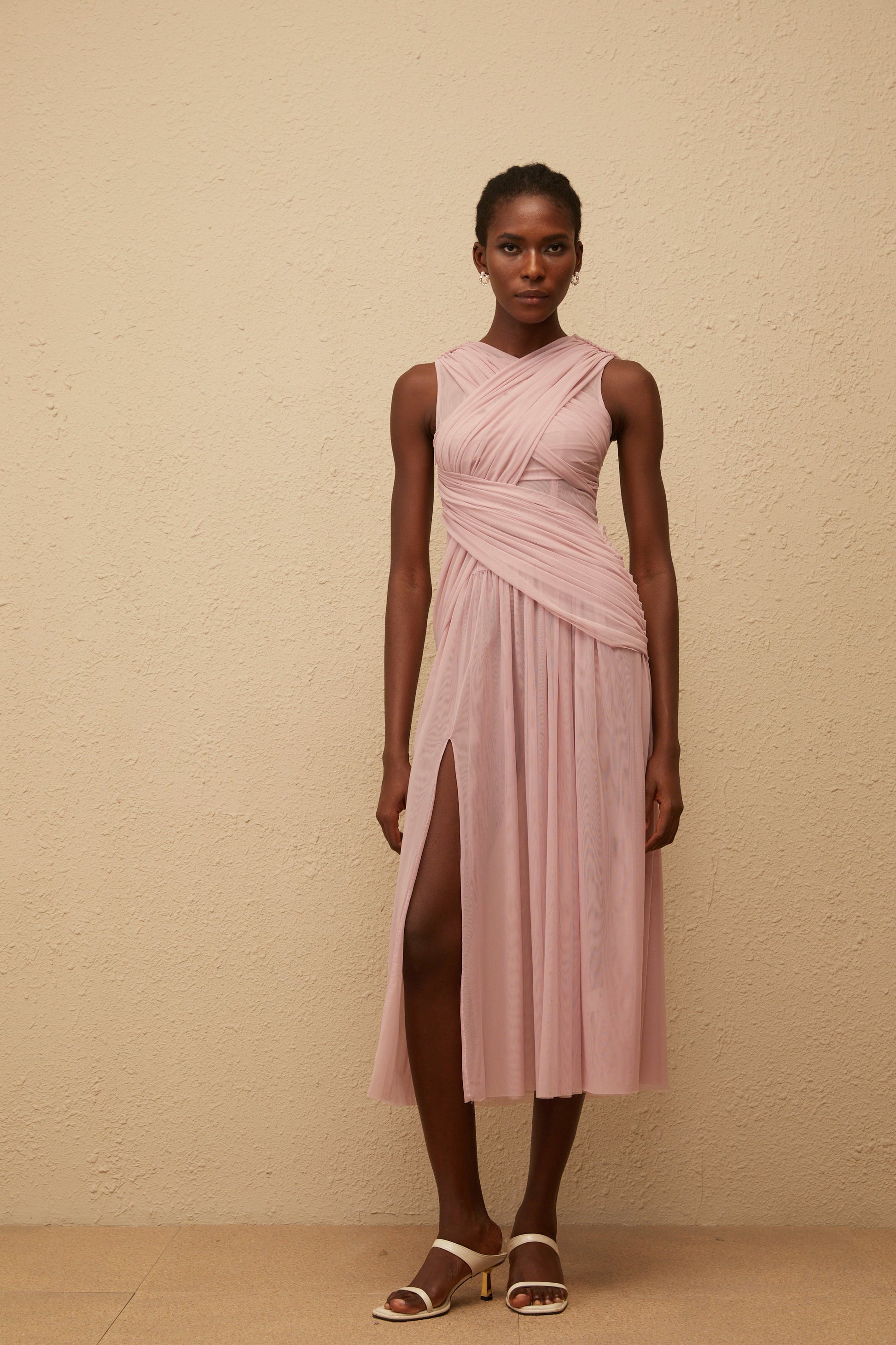 Sérénité Lilac Cross-Over Mesh Midi Dress