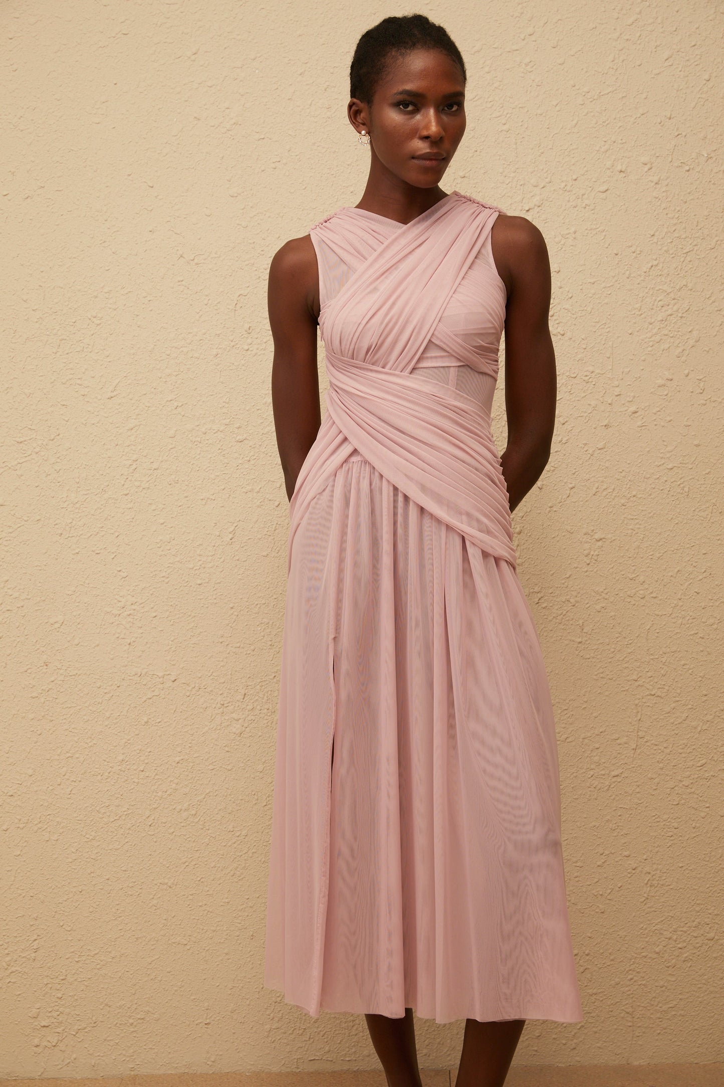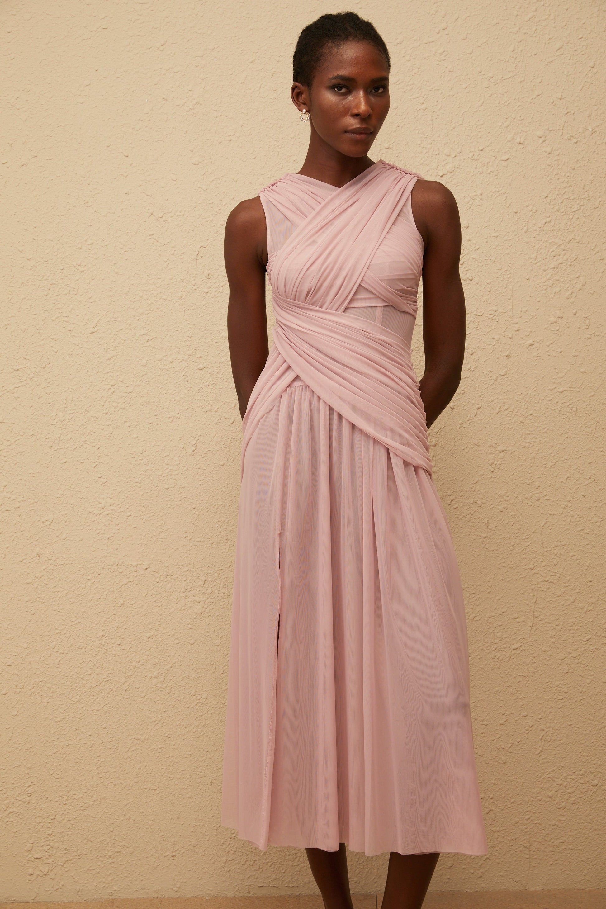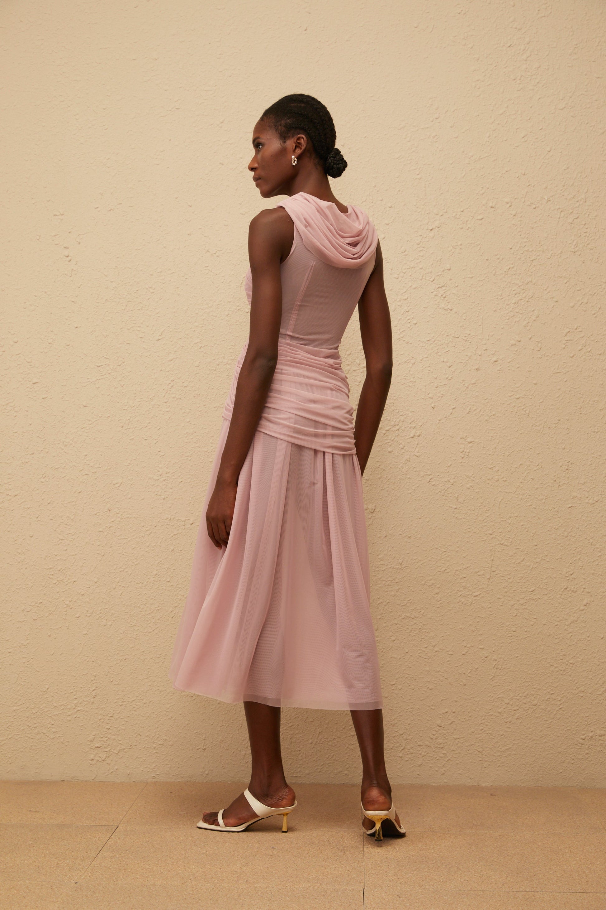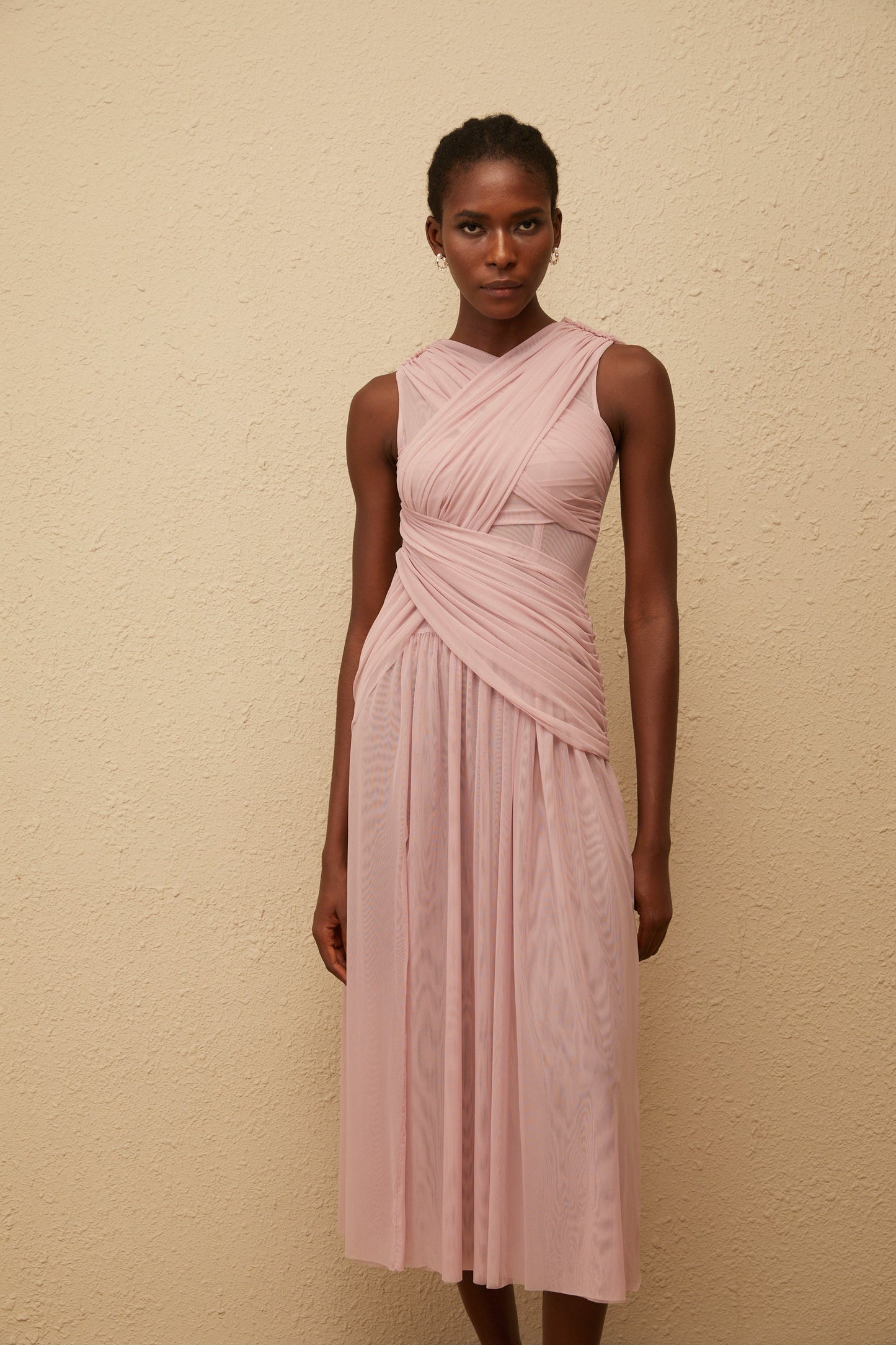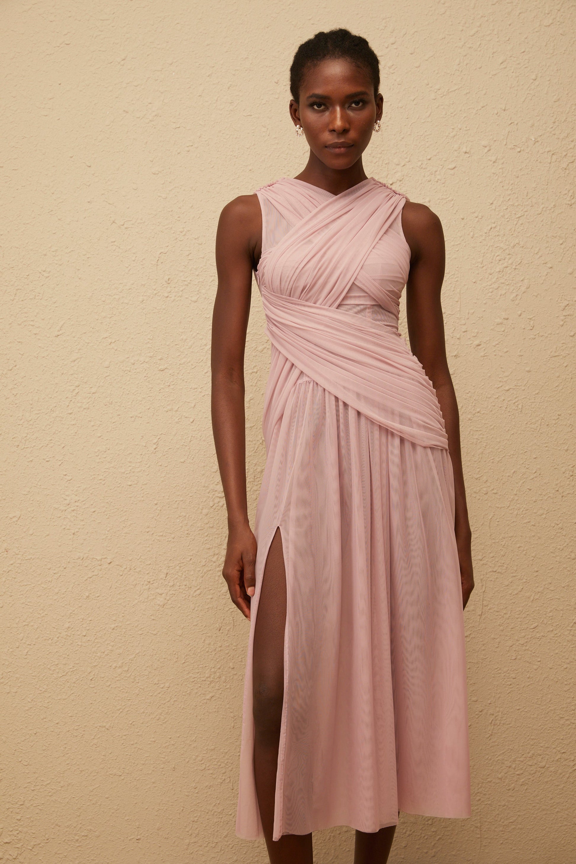 Sérénité Lilac Cross-Over Mesh Midi Dress